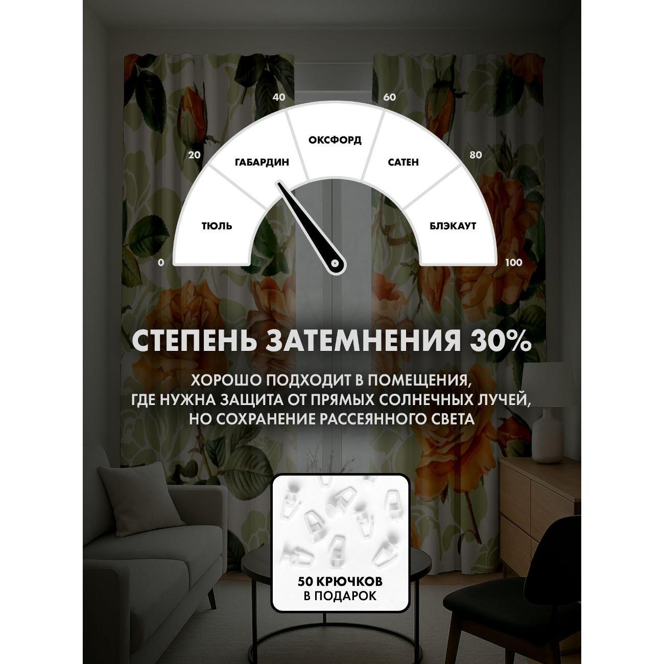 Степень затемнения - 30%. Два способа крепления - на карниз с помощью крючков и на трубу при помощи кармана. Высота 230 см, ширина одного полотна - 145 см. В комплекте 2 полотна. Тон изображения может незначительно отличаться от представленной на сайте фотографии. Тыльная сторона портьеры не имеет изображения.