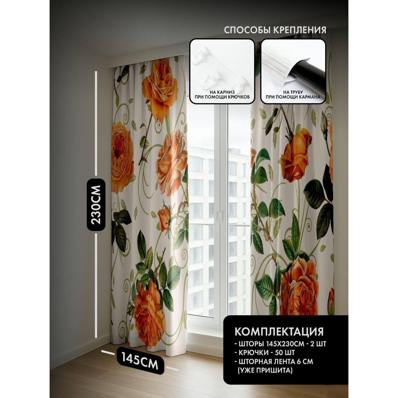 Комплект фотоштор 3D от бренда 365home с дизайном - Оранжевые розы с зелёными листьями на светлом фоне. Оригинальное решение, позволяющее обновить ваш дом, придать ему неповторимый стиль, красоту и подарить его обитателям комфорт и уют, а также стать надёжной защитой от городского шума и холода зимой.