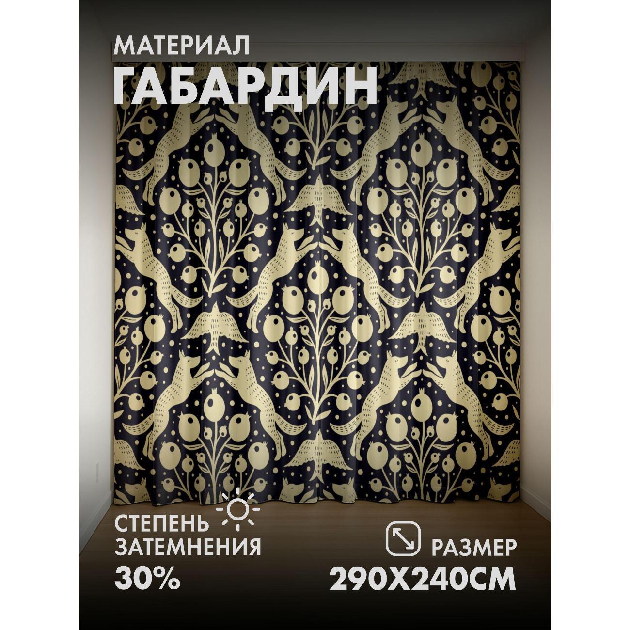 Комплект фотоштор 3D от бренда 365home с дизайном - Орнамент с лисами, птицами и плодами на тёмном фоне. Оригинальное решение, позволяющее обновить ваш дом, придать ему неповторимый стиль, красоту и подарить его обитателям комфорт и уют, а также стать надёжной защитой от городского шума и холода зимой.