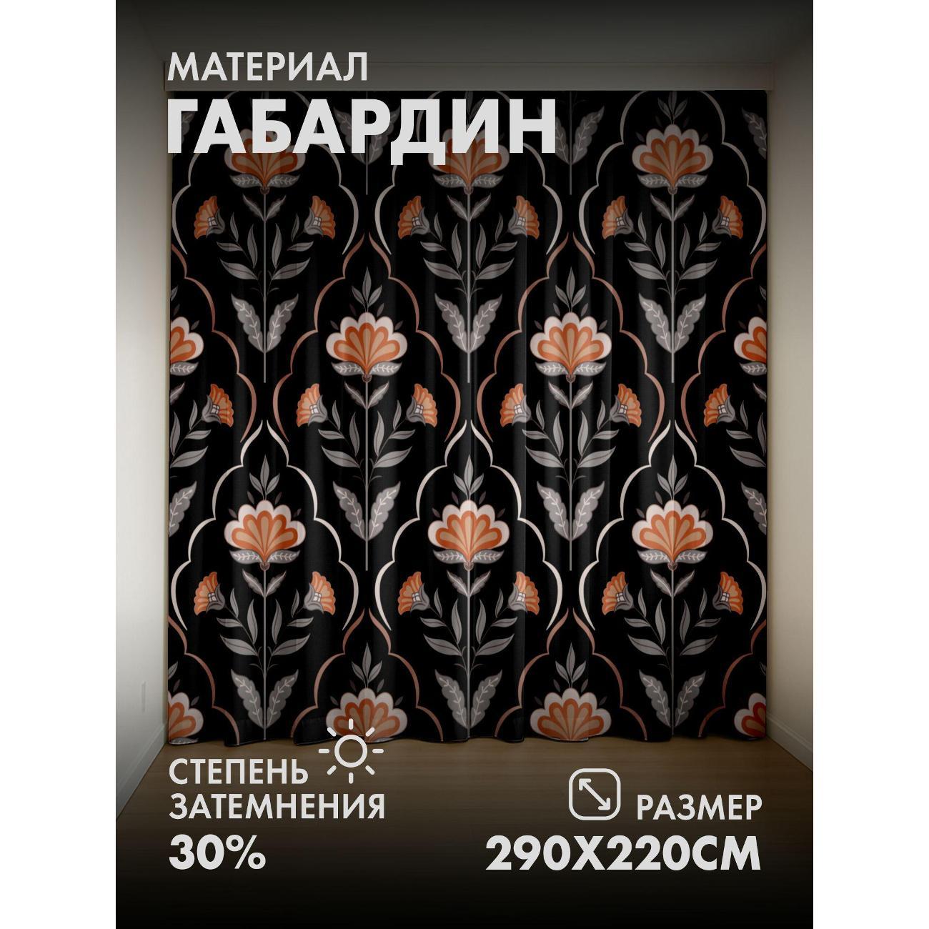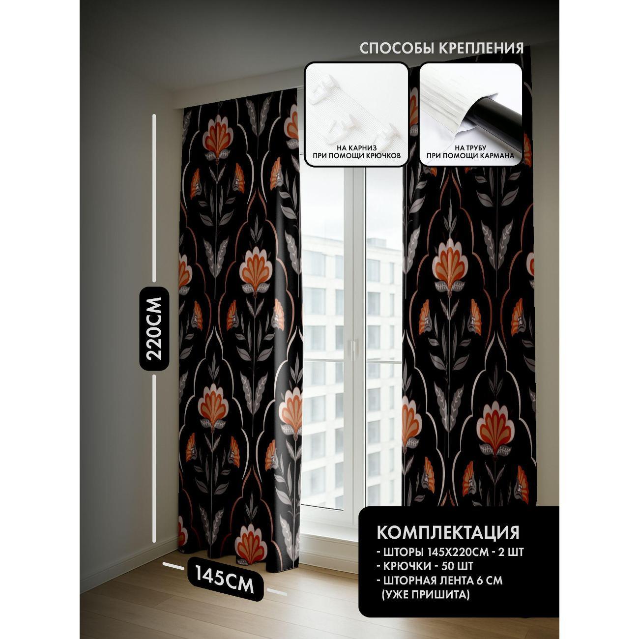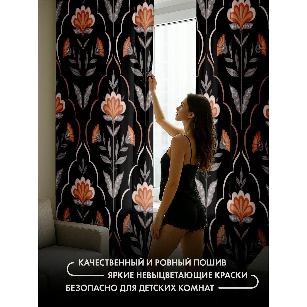Комплект фотоштор 3D от бренда 365home с дизайном - Орнамент с оранжевыми цветами и серыми листьями на чёрном фоне. Оригинальное решение, позволяющее обновить ваш дом, придать ему неповторимый стиль, красоту и подарить его обитателям комфорт и уют, а также стать надёжной защитой от городского шума и холода зимой.