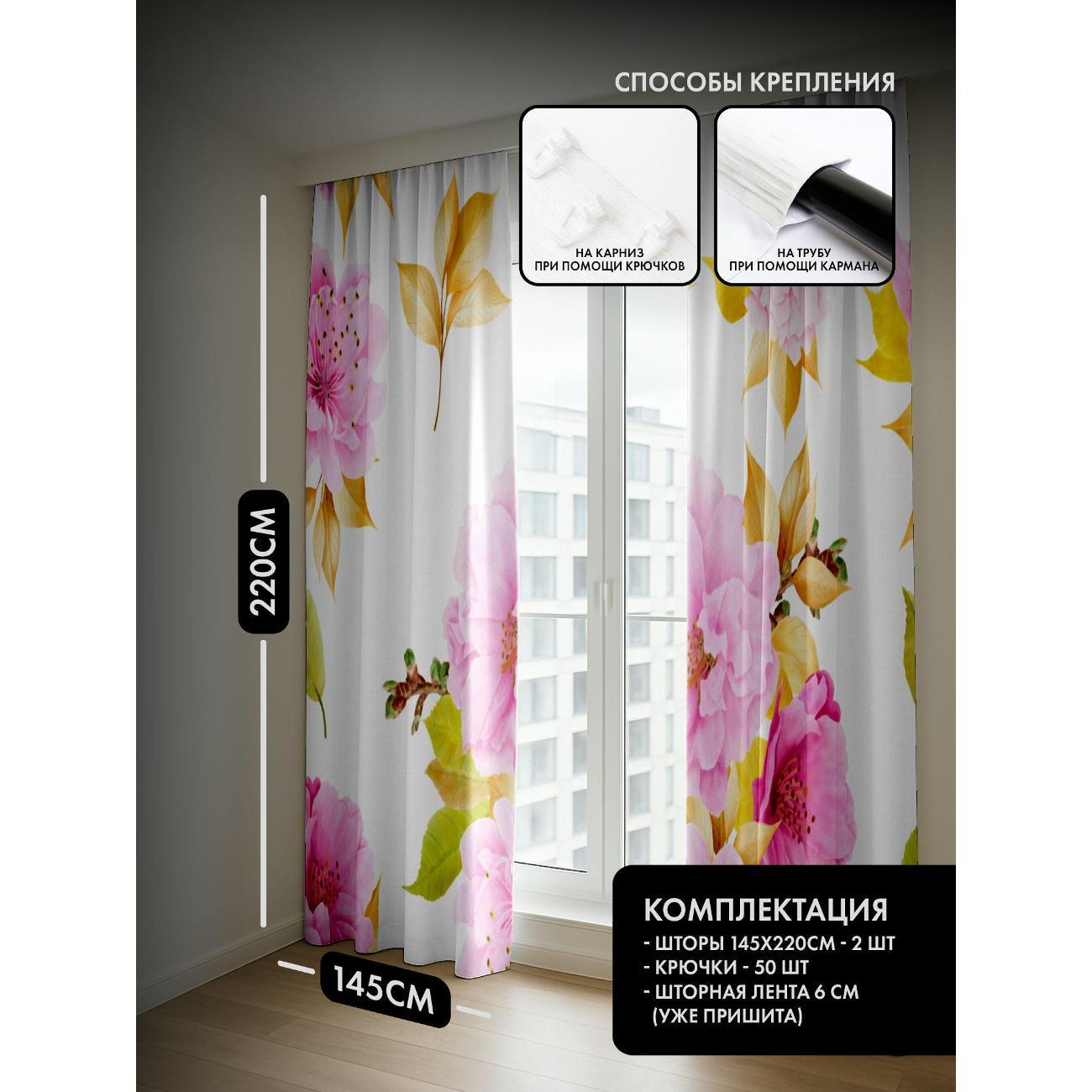 Комплект фотоштор 3D от бренда 365home с дизайном - Розовые цветы и жёлто-зелёные листья на белом фоне. Оригинальное решение, позволяющее обновить ваш дом, придать ему неповторимый стиль, красоту и подарить его обитателям комфорт и уют, а также стать надёжной защитой от городского шума и холода зимой.