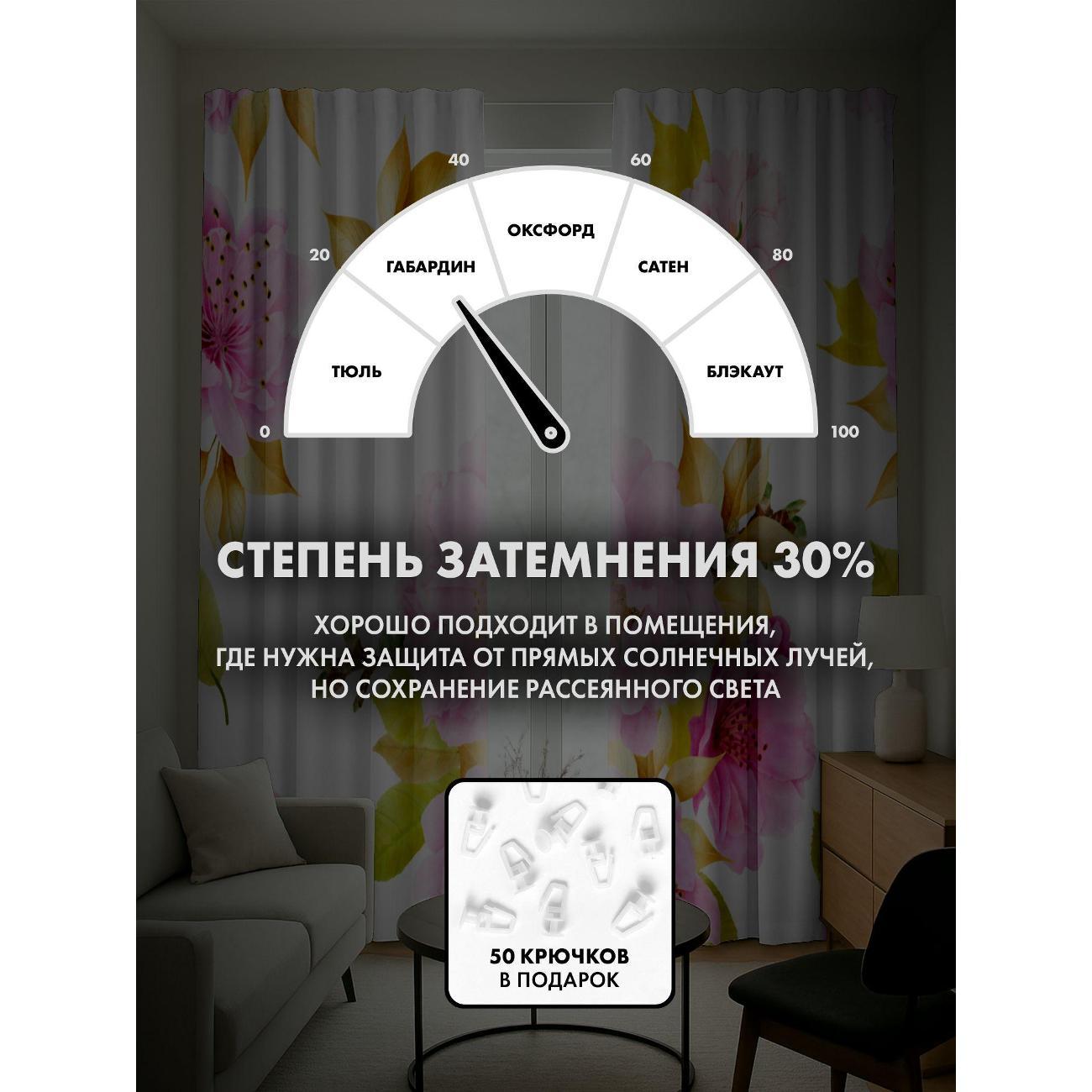 Степень затемнения - 30%. Два способа крепления - на карниз с помощью крючков и на трубу при помощи кармана. Высота 220 см, ширина одного полотна - 145 см. В комплекте 2 полотна. Тон изображения может незначительно отличаться от представленной на сайте фотографии. Тыльная сторона портьеры не имеет изображения.