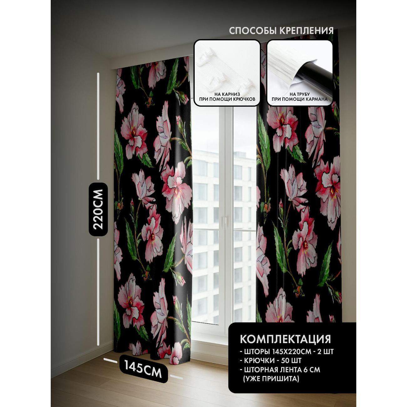 Комплект фотоштор 3D от бренда 365home с дизайном - Розовые цветы с зелёными листьями на чёрном фоне. Оригинальное решение, позволяющее обновить ваш дом, придать ему неповторимый стиль, красоту и подарить его обитателям комфорт и уют, а также стать надёжной защитой от городского шума и холода зимой.