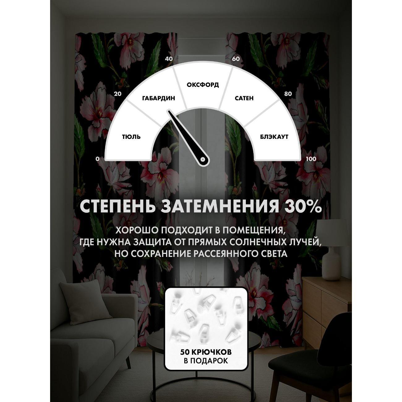 Степень затемнения - 30%. Два способа крепления - на карниз с помощью крючков и на трубу при помощи кармана. Высота 220 см, ширина одного полотна - 145 см. В комплекте 2 полотна. Тон изображения может незначительно отличаться от представленной на сайте фотографии. Тыльная сторона портьеры не имеет изображения.