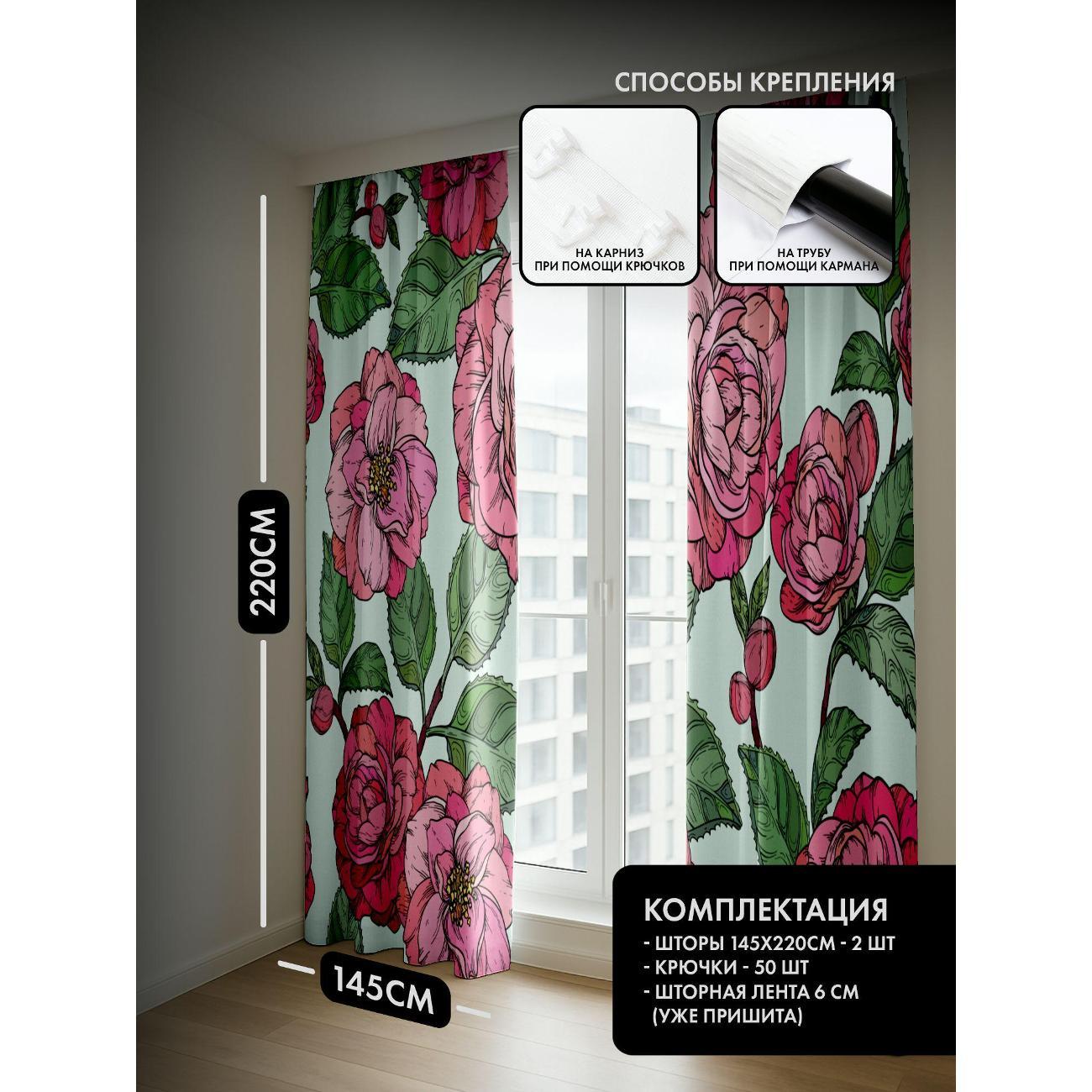 Комплект фотоштор 3D от бренда 365home с дизайном - Розовые цветы с зелёными листьями, бесшовный узор. Оригинальное решение, позволяющее обновить ваш дом, придать ему неповторимый стиль, красоту и подарить его обитателям комфорт и уют, а также стать надёжной защитой от городского шума и холода зимой.