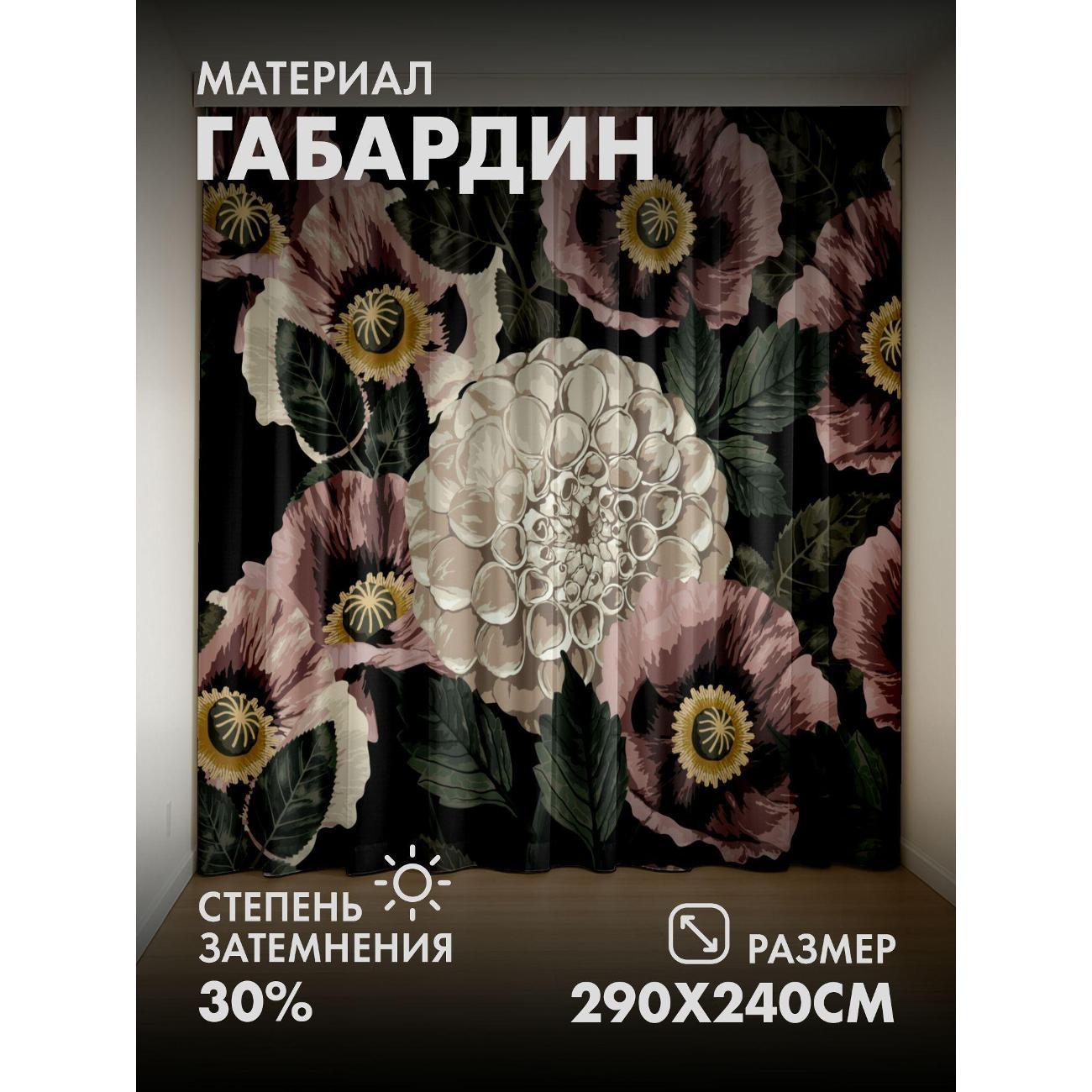 Комплект фотоштор 3D от бренда 365home с дизайном - Розовые маки и кремовые георгины на чёрном фоне. Оригинальное решение, позволяющее обновить ваш дом, придать ему неповторимый стиль, красоту и подарить его обитателям комфорт и уют, а также стать надёжной защитой от городского шума и холода зимой.