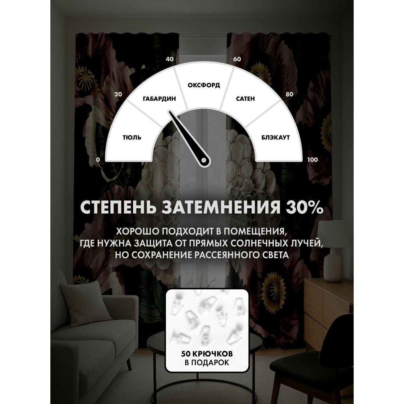 Степень затемнения - 30%. Два способа крепления - на карниз с помощью крючков и на трубу при помощи кармана. Высота 240 см, ширина одного полотна - 145 см. В комплекте 2 полотна. Тон изображения может незначительно отличаться от представленной на сайте фотографии. Тыльная сторона портьеры не имеет изображения.