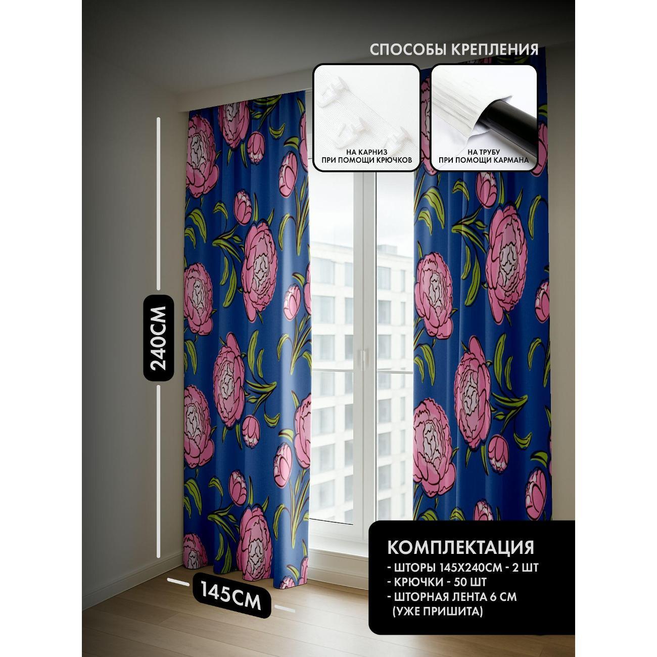 Комплект фотоштор 3D от бренда 365home с дизайном - Розовые пионы с зелёными листьями на синем фоне. Оригинальное решение, позволяющее обновить ваш дом, придать ему неповторимый стиль, красоту и подарить его обитателям комфорт и уют, а также стать надёжной защитой от городского шума и холода зимой.