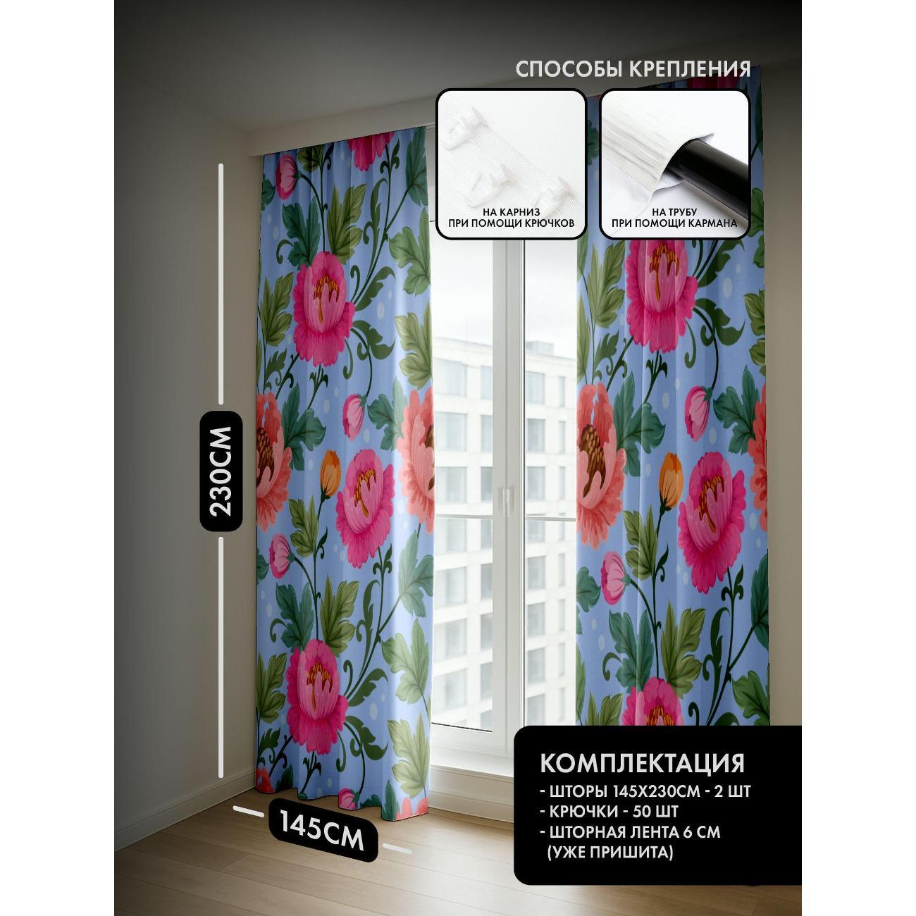 Комплект фотоштор 3D от бренда 365home с дизайном - Розовые пионы с зелёными листьями на голубом фоне. Оригинальное решение, позволяющее обновить ваш дом, придать ему неповторимый стиль, красоту и подарить его обитателям комфорт и уют, а также стать надёжной защитой от городского шума и холода зимой.