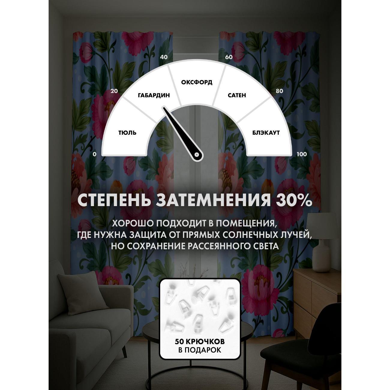 Степень затемнения - 30%. Два способа крепления - на карниз с помощью крючков и на трубу при помощи кармана. Высота 230 см, ширина одного полотна - 145 см. В комплекте 2 полотна. Тон изображения может незначительно отличаться от представленной на сайте фотографии. Тыльная сторона портьеры не имеет изображения.