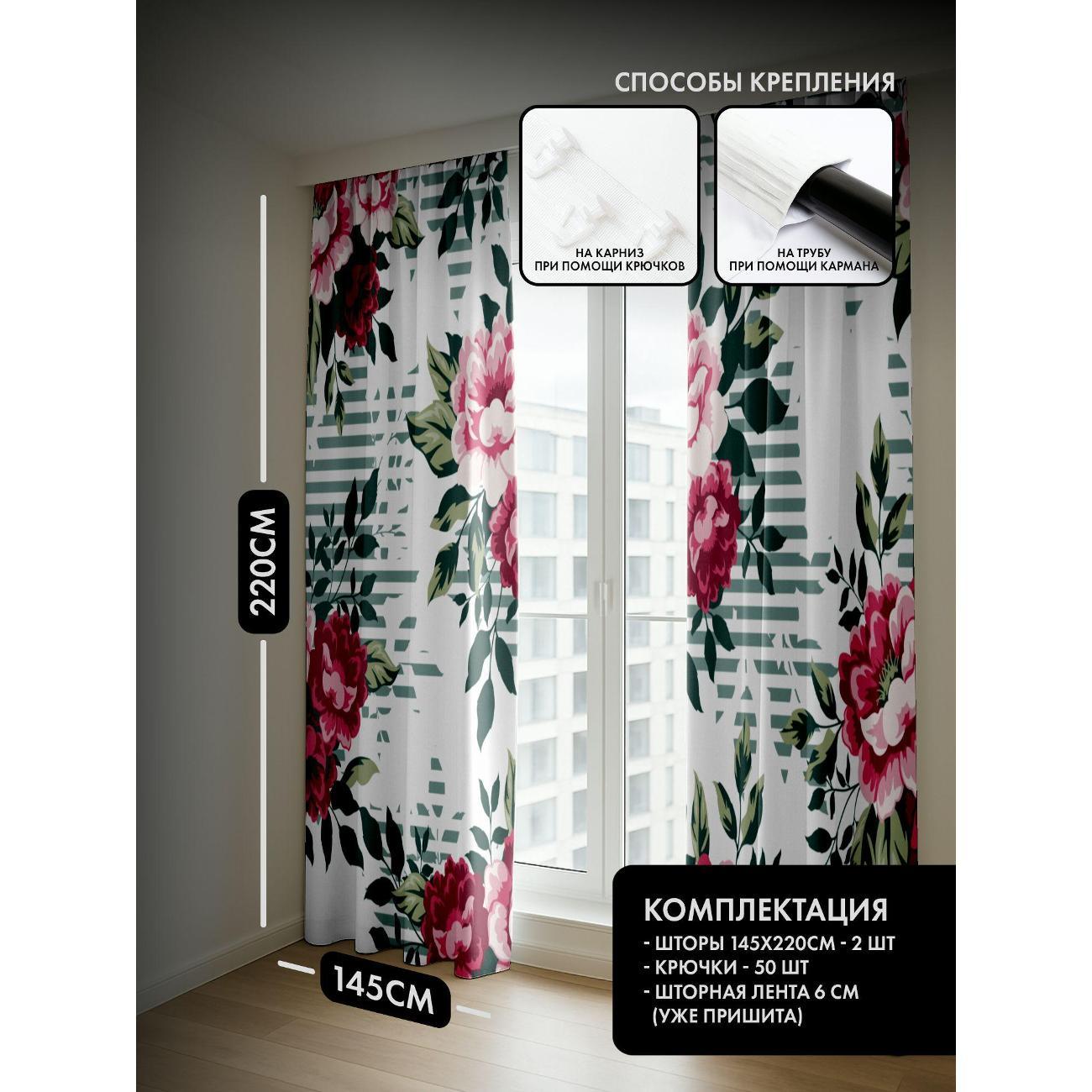 Комплект фотоштор 3D от бренда 365home с дизайном - Розовые пионы с зелёными листьями на полосатом фоне. Оригинальное решение, позволяющее обновить ваш дом, придать ему неповторимый стиль, красоту и подарить его обитателям комфорт и уют, а также стать надёжной защитой от городского шума и холода зимой.