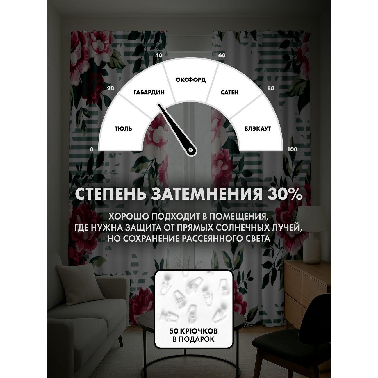 Степень затемнения - 30%. Два способа крепления - на карниз с помощью крючков и на трубу при помощи кармана. Высота 220 см, ширина одного полотна - 145 см. В комплекте 2 полотна. Тон изображения может незначительно отличаться от представленной на сайте фотографии. Тыльная сторона портьеры не имеет изображения.