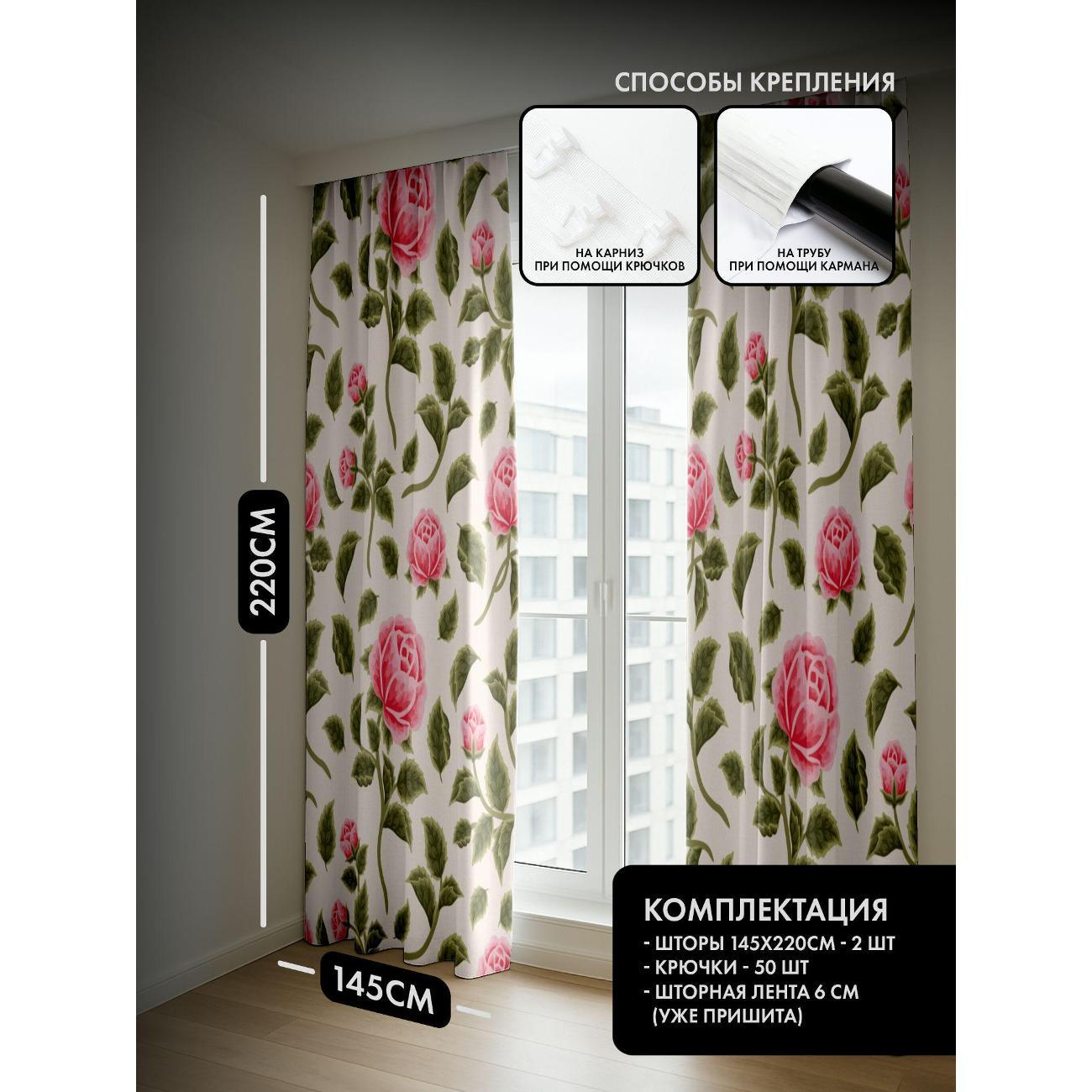 Комплект фотоштор 3D от бренда 365home с дизайном - Розовые розы с зелёными листьями, узорный фон. Оригинальное решение, позволяющее обновить ваш дом, придать ему неповторимый стиль, красоту и подарить его обитателям комфорт и уют, а также стать надёжной защитой от городского шума и холода зимой.