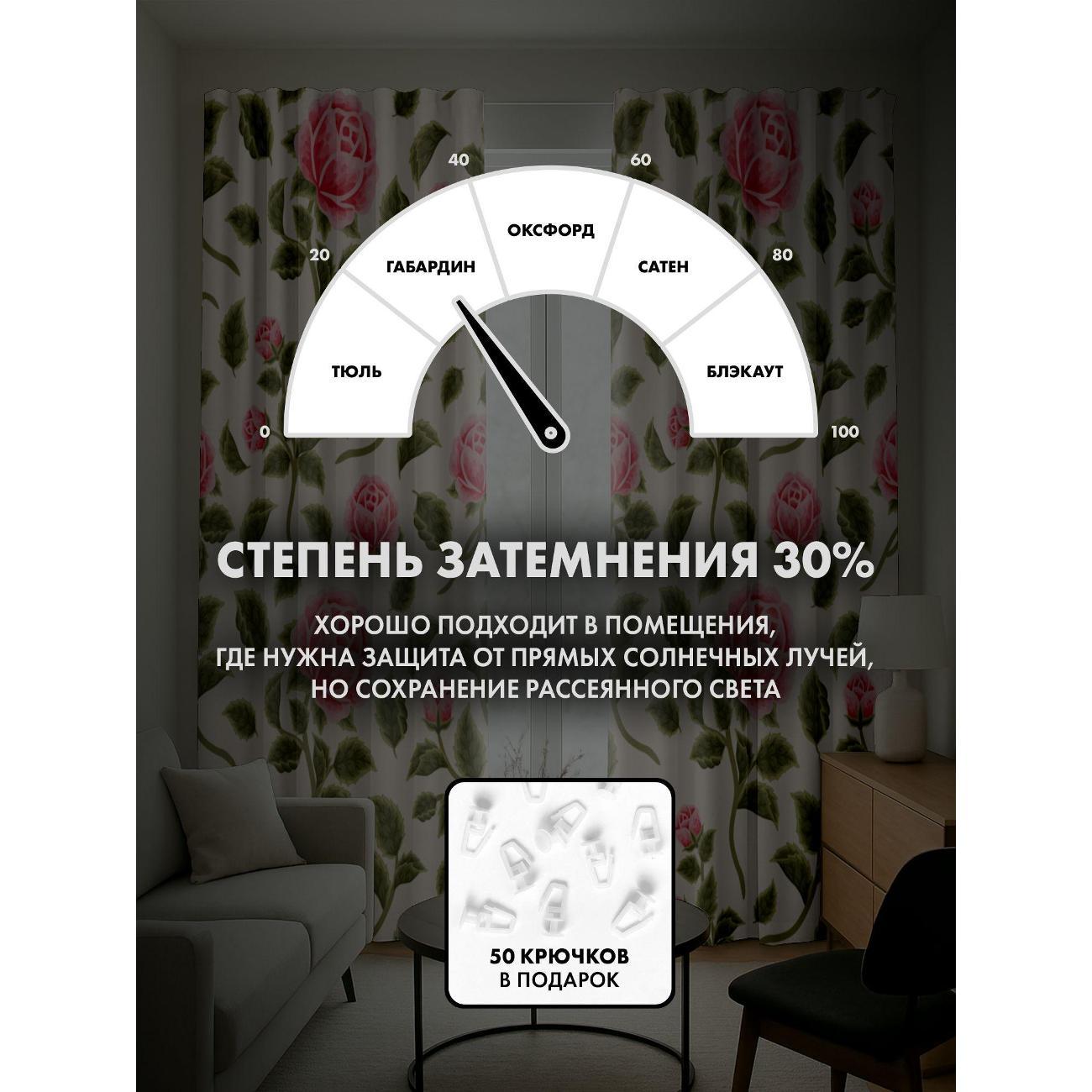 Степень затемнения - 30%. Два способа крепления - на карниз с помощью крючков и на трубу при помощи кармана. Высота 220 см, ширина одного полотна - 145 см. В комплекте 2 полотна. Тон изображения может незначительно отличаться от представленной на сайте фотографии. Тыльная сторона портьеры не имеет изображения.