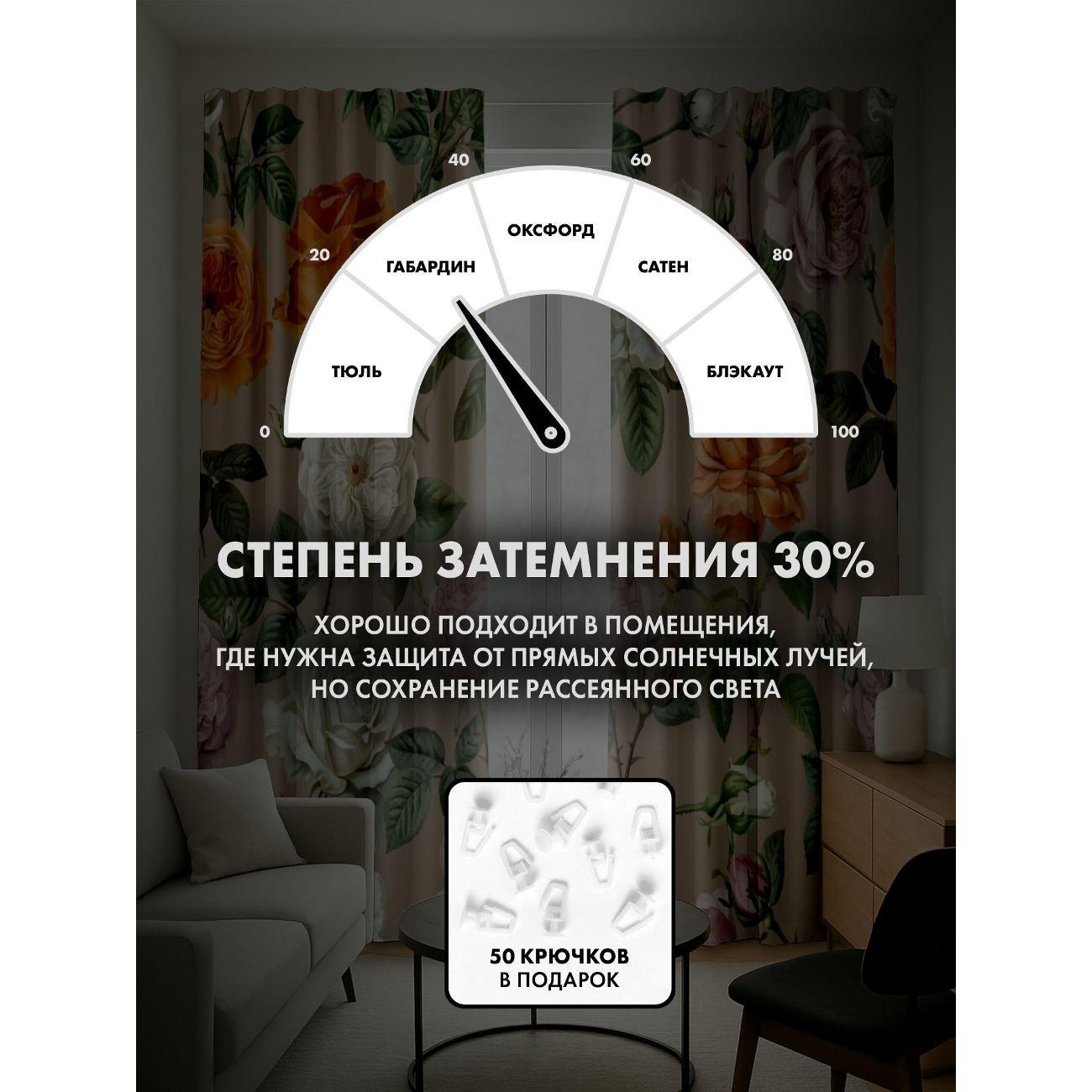 Степень затемнения - 30%. Два способа крепления - на карниз с помощью крючков и на трубу при помощи кармана. Высота 220 см, ширина одного полотна - 145 см. В комплекте 2 полотна. Тон изображения может незначительно отличаться от представленной на сайте фотографии. Тыльная сторона портьеры не имеет изображения.