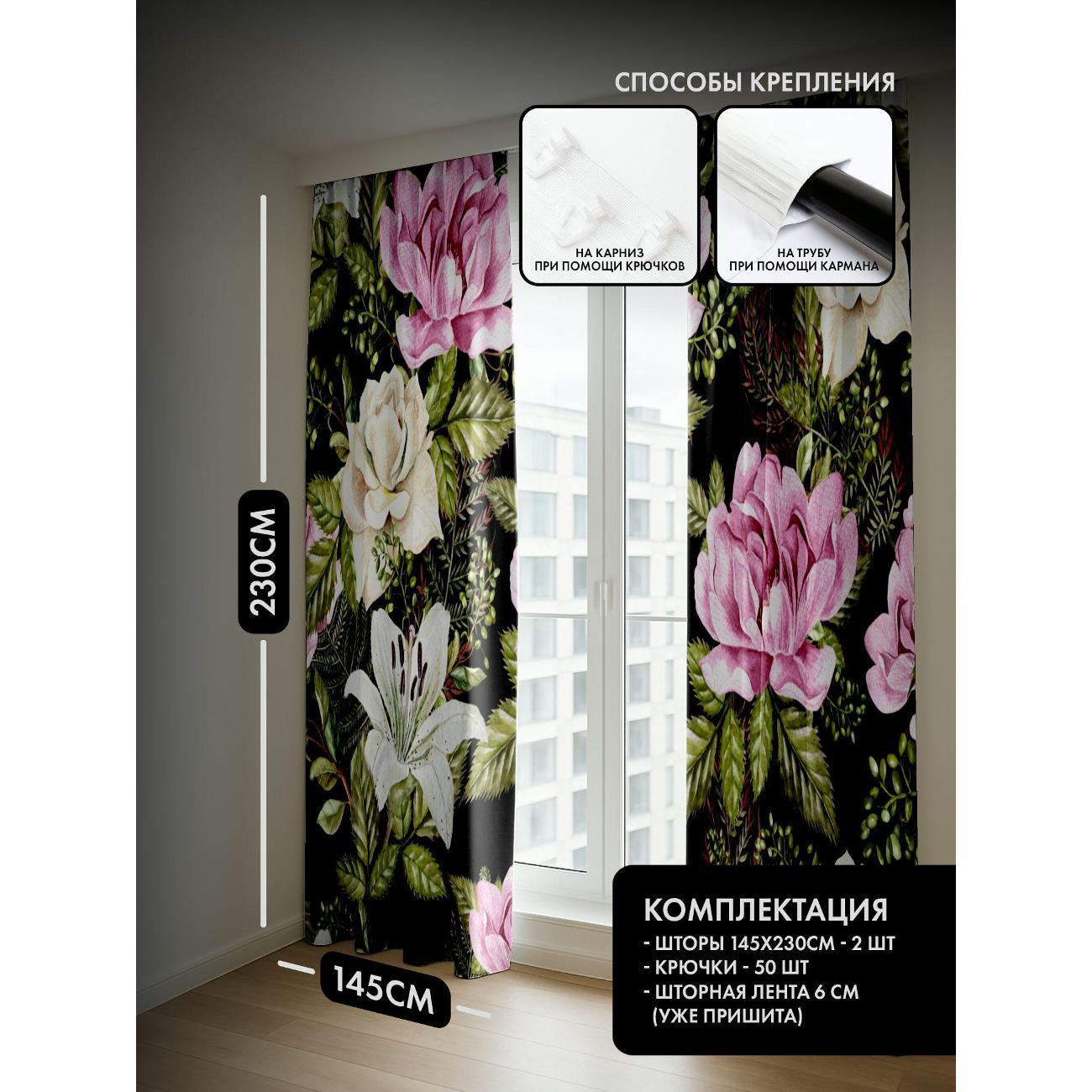 Комплект фотоштор 3D от бренда 365home с дизайном - Розы и лилии с зелёной листвой на чёрном фоне. Оригинальное решение, позволяющее обновить ваш дом, придать ему неповторимый стиль, красоту и подарить его обитателям комфорт и уют, а также стать надёжной защитой от городского шума и холода зимой.