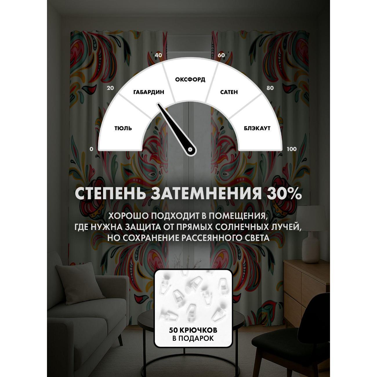 Степень затемнения - 30%. Два способа крепления - на карниз с помощью крючков и на трубу при помощи кармана. Высота 240 см, ширина одного полотна - 145 см. В комплекте 2 полотна. Тон изображения может незначительно отличаться от представленной на сайте фотографии. Тыльная сторона портьеры не имеет изображения.