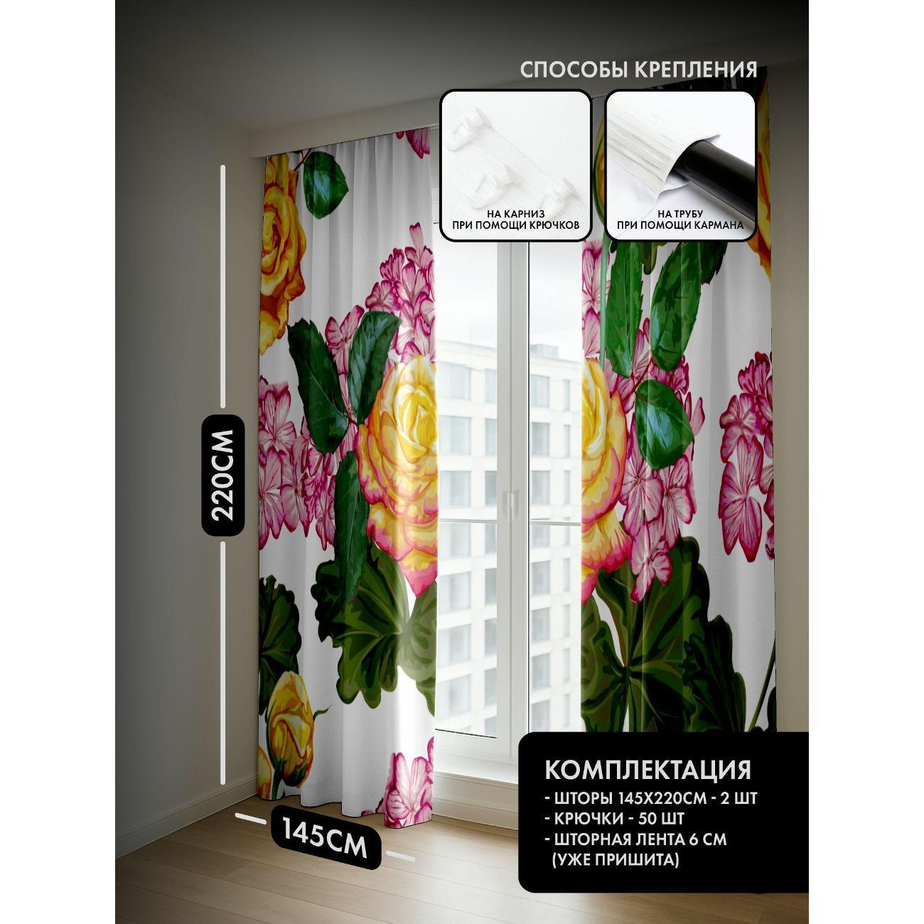 Комплект фотоштор 3D от бренда 365home с дизайном - Жёлтые розы и розовые гортензии с зелёными листьями. Оригинальное решение, позволяющее обновить ваш дом, придать ему неповторимый стиль, красоту и подарить его обитателям комфорт и уют, а также стать надёжной защитой от городского шума и холода зимой.