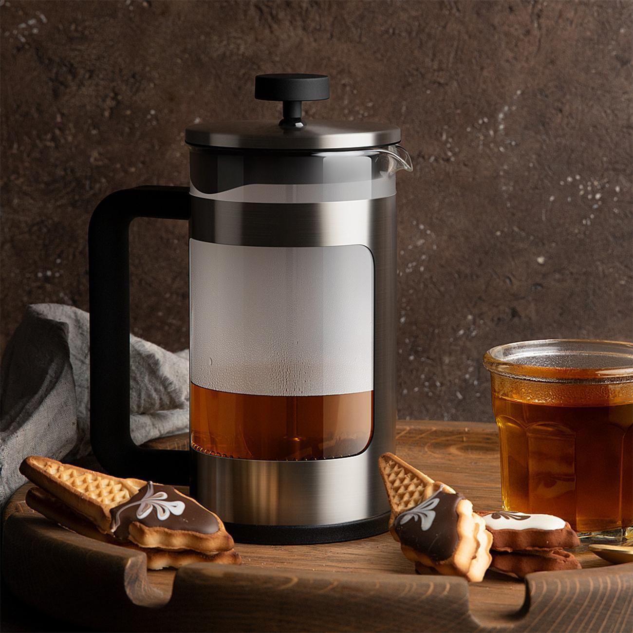 В комплекте идет мерная ложечка. Прибор разборный. Его можно мыть в посудомоечной машине. Френч-пресс оснащен многослойной системой фильтрации, которая предотвращает попадание в напиток даже самых мелких частиц.