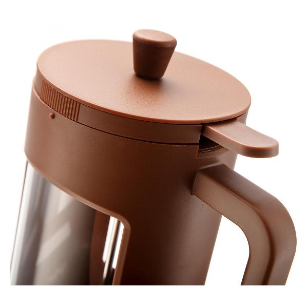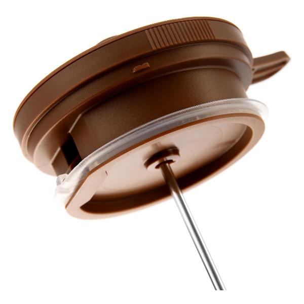 Герметичность обеспечивает силиконовое кольцо на крышке. Присутствует металлическое ситечко, которое выполняет роль фильтра. Модель можно мыть в посудомоечной машине, это облегчает уход. Вес составляет 550 г, габаритные размеры — 23х12х15 см.