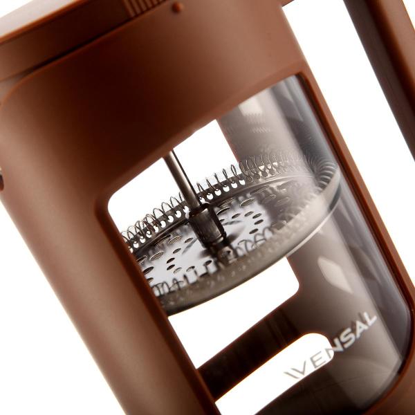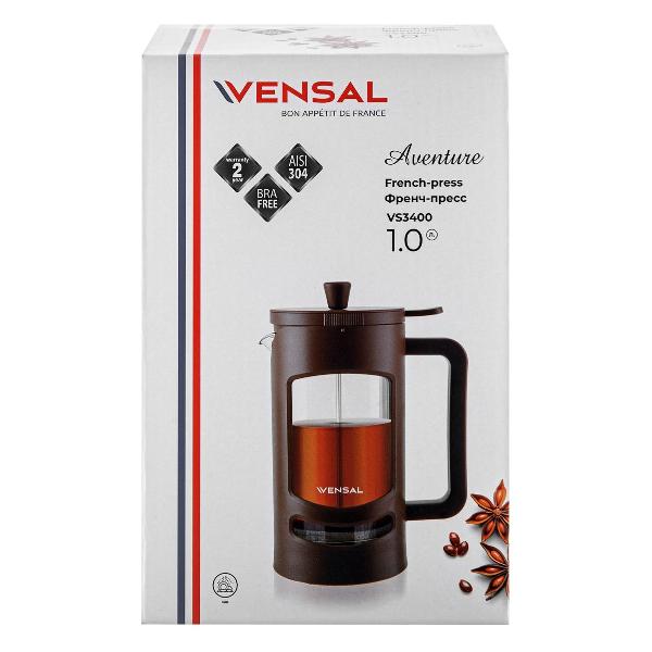 Френч-пресс Vensal VS3400 объемом 1 л используется для приготовления листового чая, молотого кофе, фруктовых напитков, заваривания трав. Выполнен в коричневом цвете, корпус изготовлен из пластика, колба — термостойкое боросиликатное стекло.