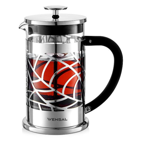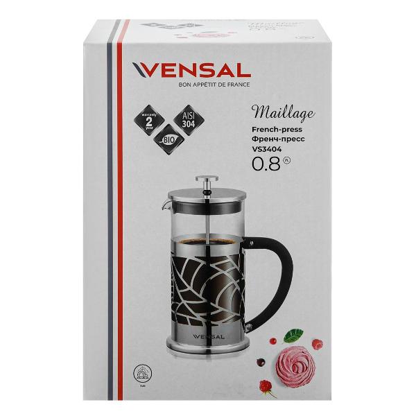 Френч-пресс Vensal VS3404 применяется для приготовления чайных, кофейных или фруктовых напитков. Конструкция состоит из пластикового корпуса, емкости для напитка из термоустойчивого боросиликатного стекла и внутреннего фильтра из антикоррозийного металла. Объем колбы составляет 800 мл. Для очищения изделия допускается использование посудомоечной машины.
