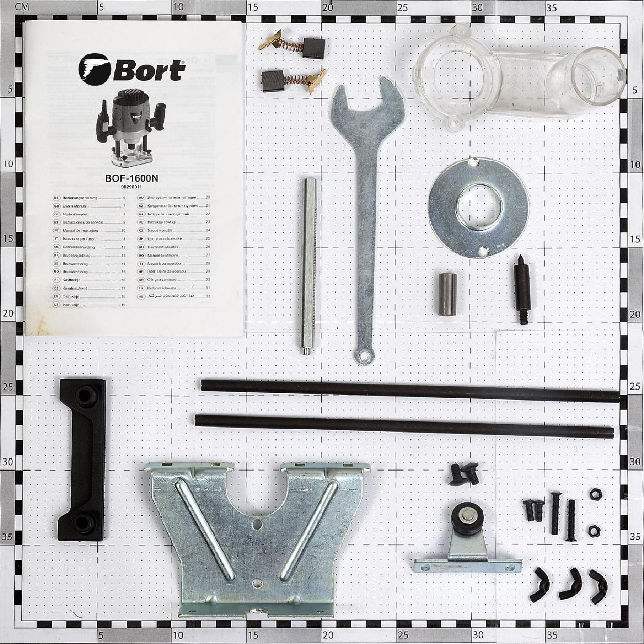 Фрезер Bort BOF-1600N — электрический инструмент черно-синего цвета, снабженный двумя прорезиненными ручками и плоской рабочей подошвой. Модель потребляет 1,5 кВт энергии, позволяя регулировать скорость вращения фрезы от 12000 об/мин до 26000 об/мин.
