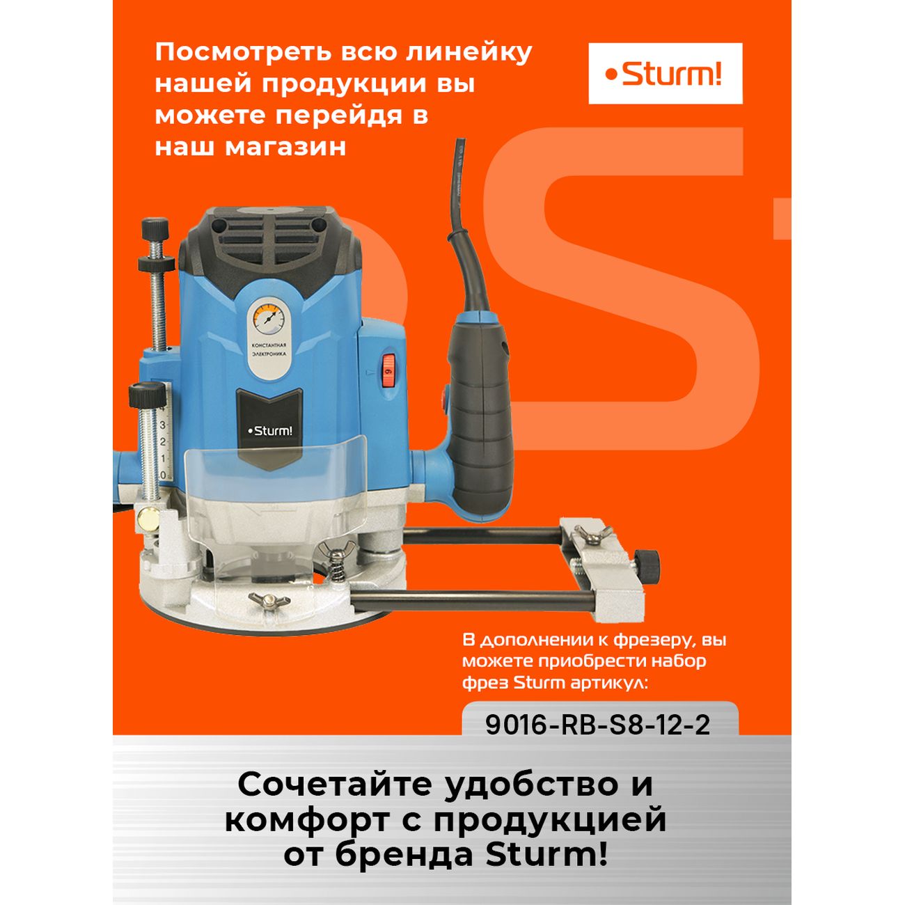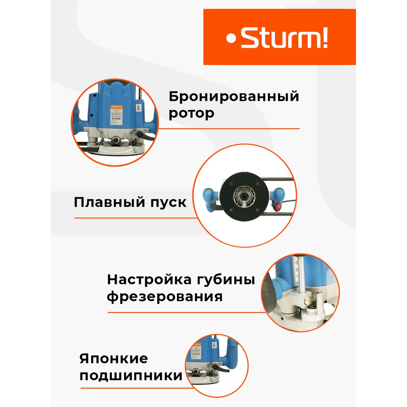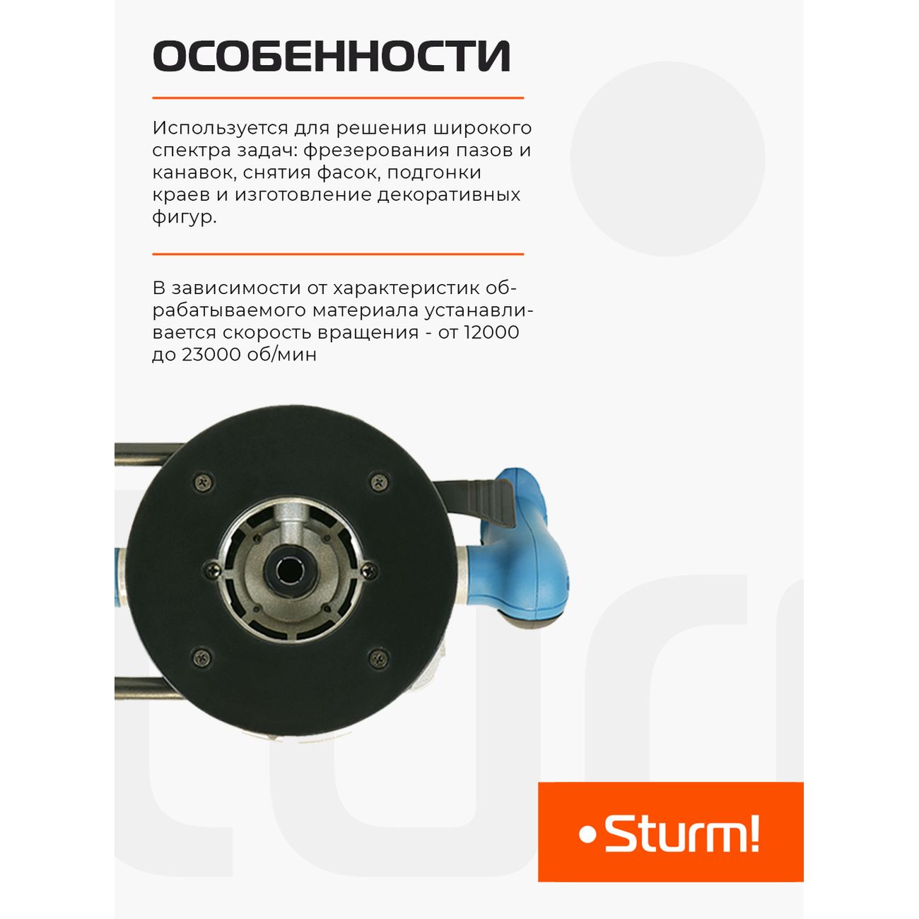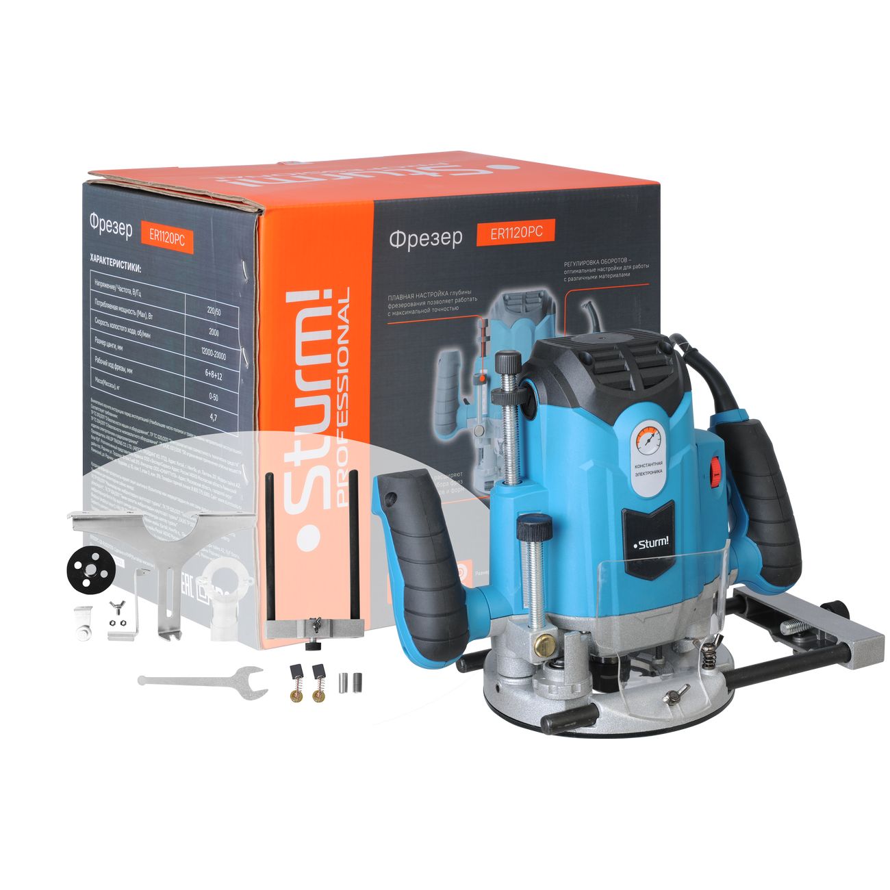 Фрезер Sturm! ER1120PC с мощным мотором на 2000 Вт и константной электроникой. Скорость вращения можно регулировать в зависимости от свойств обрабатываемого материала — от 12000 до 23000 об/мин. Глубина фрезерования — 50 мм. Рукоятки с прорезиненным покрытием, поэтому не скользят в ладонях. Для повышения надежности в приборе установлены подшипники NSK, система плавного запуска и поддержания оборотов под нагрузкой. С целью безопасности модель оснащена прозрачным щитком. К фрезеру можно подключать пылесос. В комплекте поставляются: цанги (диаметром 6, 8 и 12 мм), гаечный ключ, параллельная направляющая, графитовая щетка и адаптер для извлечения стружки. Вес без комплектующих и упаковки — 5,95 кг.