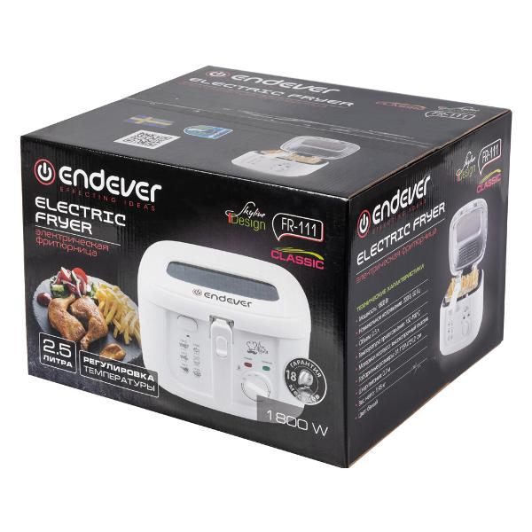 Фритюрница Endever Skyline FR-111 в корпусе белого цвета оснащена механической системой управления. Температура нагрева варьируется в пределах от 150°C до 190°C, ее можно регулировать. Габариты корзины: 22,1х20,7х12 см. Объем чаши составляет 2,5 л. Корпус фритюрницы сделан из пищевого ABS-пластика.