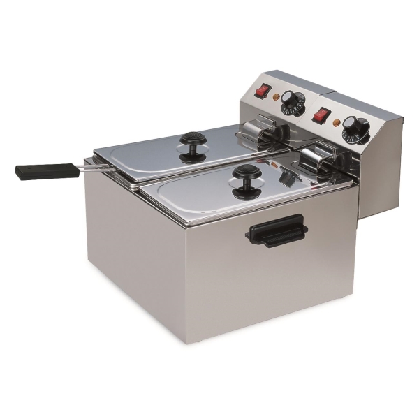 Фритюрница Gastrorag CZG-40-2 работает от электрической сети, к которой подключается при помощи кабеля длиной 1,2 м. Потребляемая мощность достигает 4000 Вт. Диапазон рабочих температур устройства варьируется от 110°С до 190°С. Корпус выполнен из металла, устойчивого к появлению коррозии. В комплекте идут две фритюрные корзины с крышками, их ручки покрыты термоизоляцией.