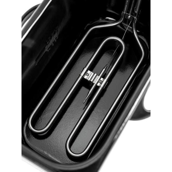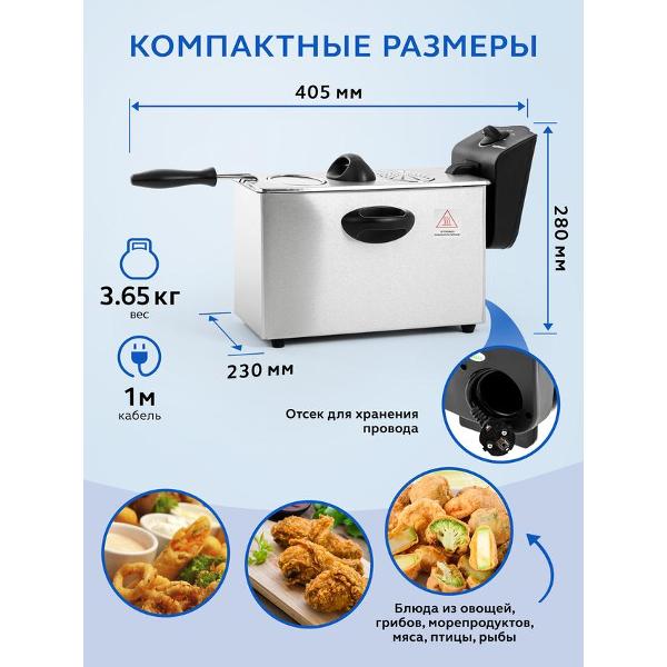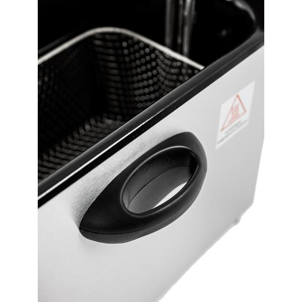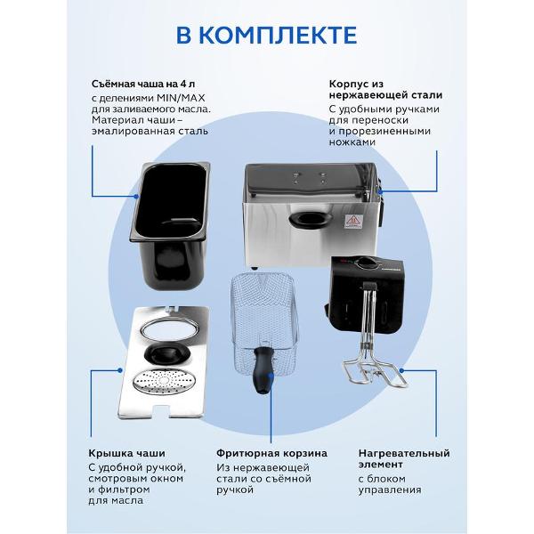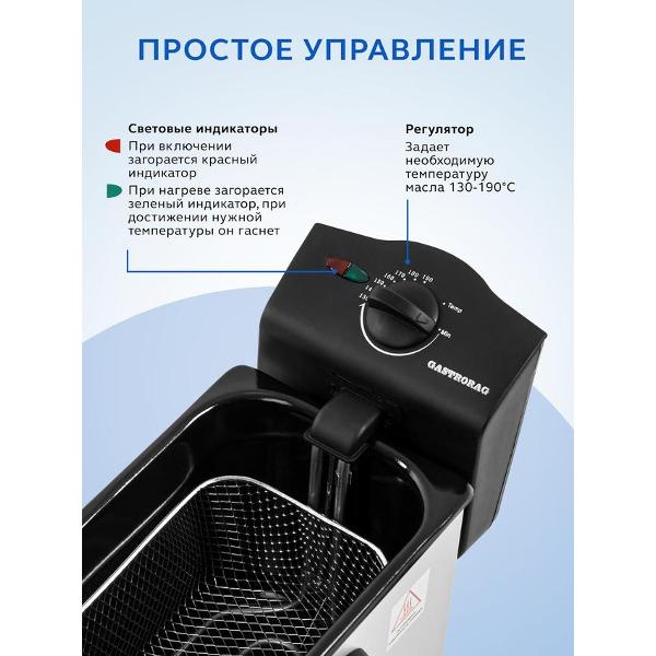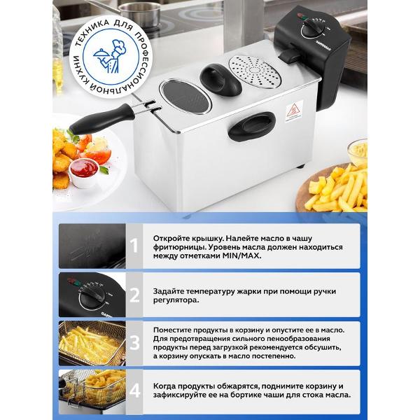 В основе работы лежит съемный нагревательный элемент. Температуру можно регулировать от 130°C до 190°C. Индикация сообщает о включении фритюрницы и готовности к работе. Корпус выполнен из нержавеющей стали, что придает ему устойчивость к деформации и механическому воздействию.