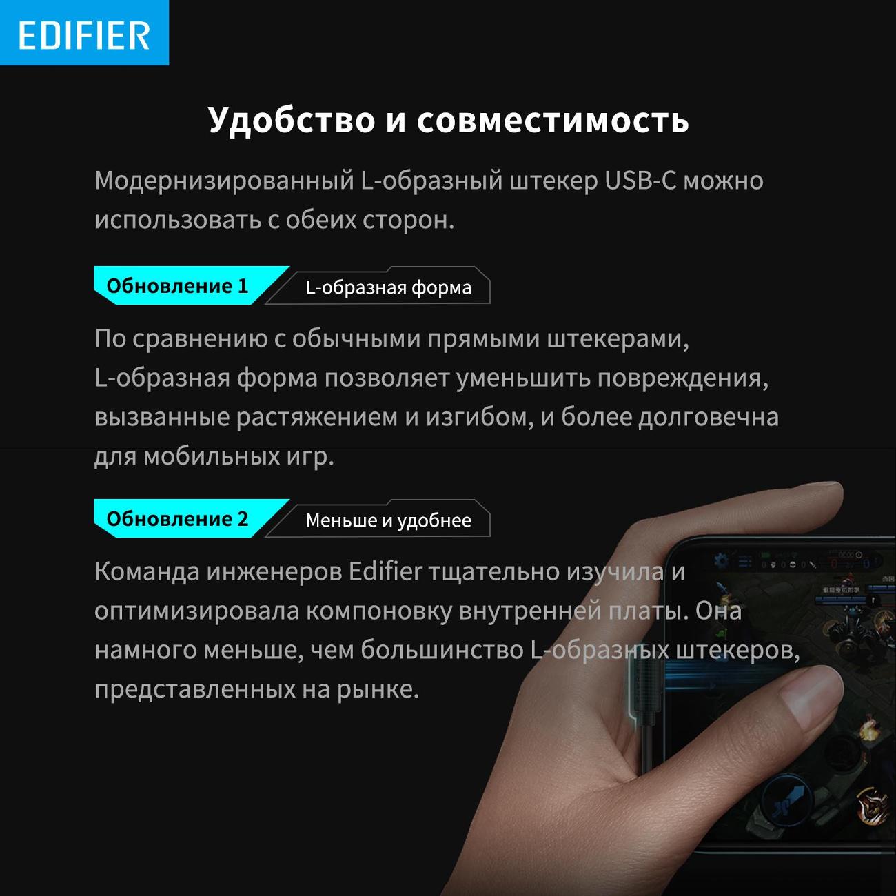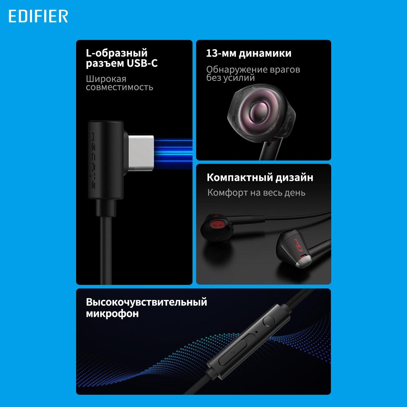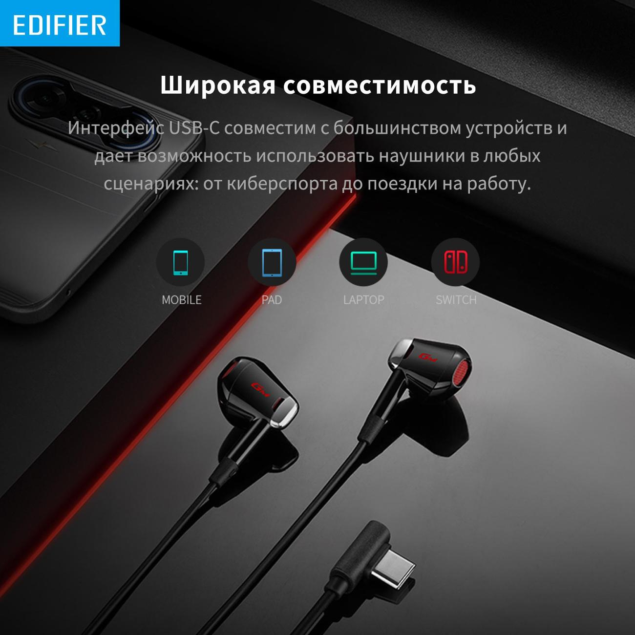 Гарнитура Edifier GM180 Plus USB-C проводного типа подключаются к внешним носителям через разъем USB Type-C кабелем длиной 1,3 м, что обеспечивает свободу движений. Наушники чувствительностью 98 дБ работают в частотном диапазоне 20-20000 Гц, что дает возможность в хорошем качестве слушать музыку, говорить по телефону, используя встроенный микрофон. Пластиковые амбушюры анатомической формы приятно и плотно прилегают к ушным раковинам. Переключателями можно регулировать громкость, управлять воспроизведением. В наборе идет складной оголовник. Вес — 15 г.