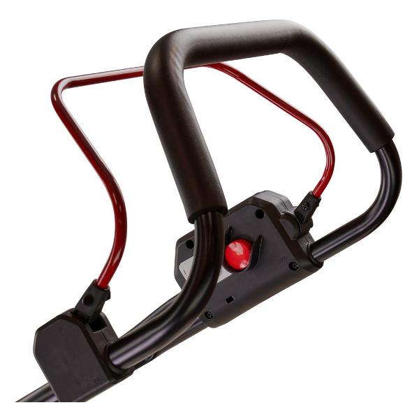 Травосборник вмещает в себя до 30 л, следить за уровнем заполнения позволяет специальный индикатор. Газонокосилка работает на одной скорости — 4300 об/мин, подходит для обработки площади до 450 м². Высота скашивания травы регулируется в диапазоне от 2 мм до 7,5 мм, ширина скашивания составляет 33 мм. Газонокосилка оснащена функцией мульчирования. Габариты модели — 106x42x132 см, вес — 16 кг.