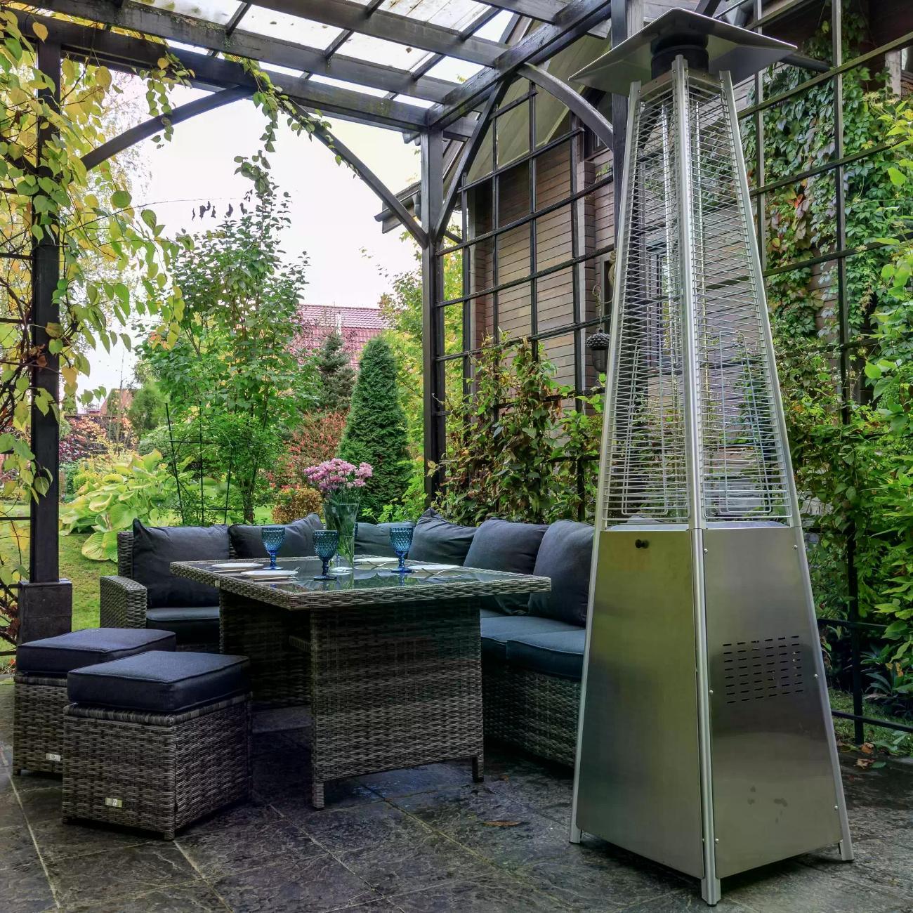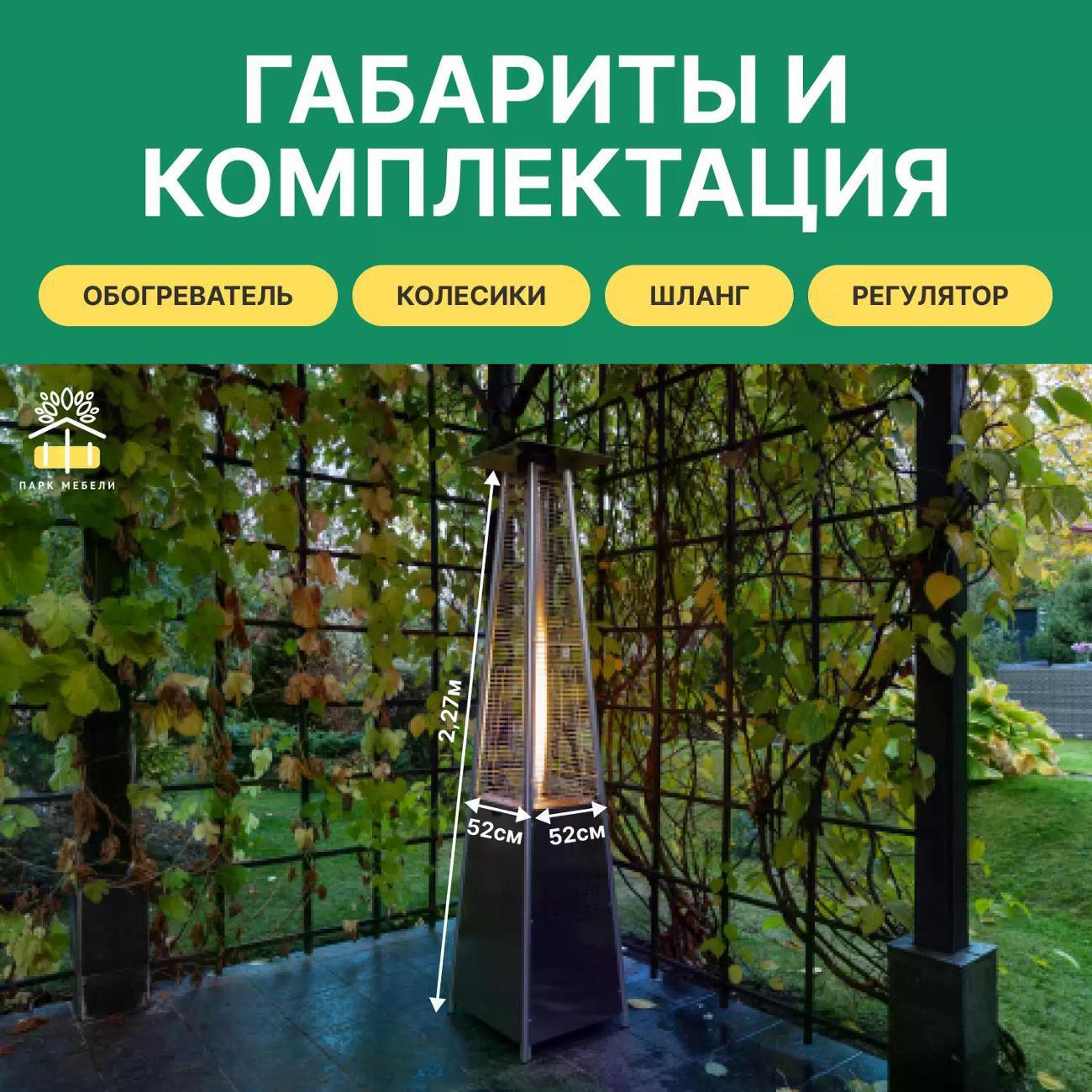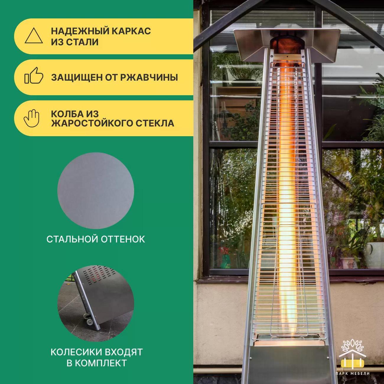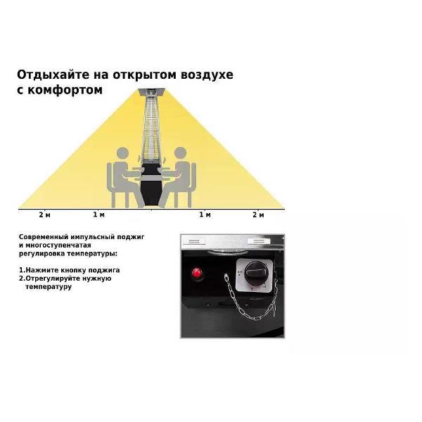 Оптимизируйте пространство для комфортного отдыха на свежем воздухе — купите уличный газовый обогреватель EVA из нержавеющей стали. Прибор в форме высокой вытянутой пирамиды — это ваш надежный партнер в холодные вечера. Модель подойдет для обогрева зоны отдыха: