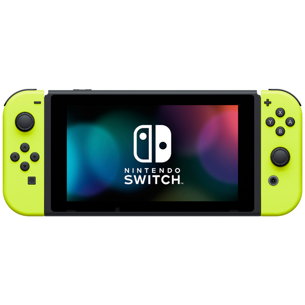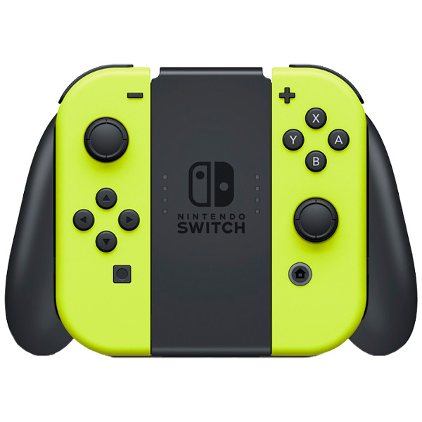 Набор включает в себя левый Joy-Con (неоново желтого цвета), правый Joy-Con (неоново желтого цвета) и два ремешка Joy-Con (серого цвета).