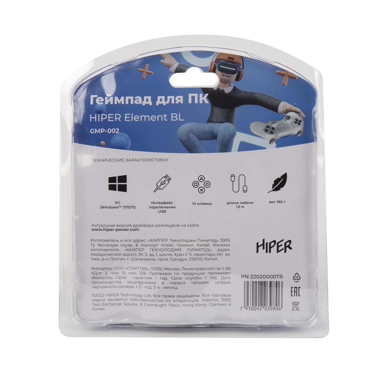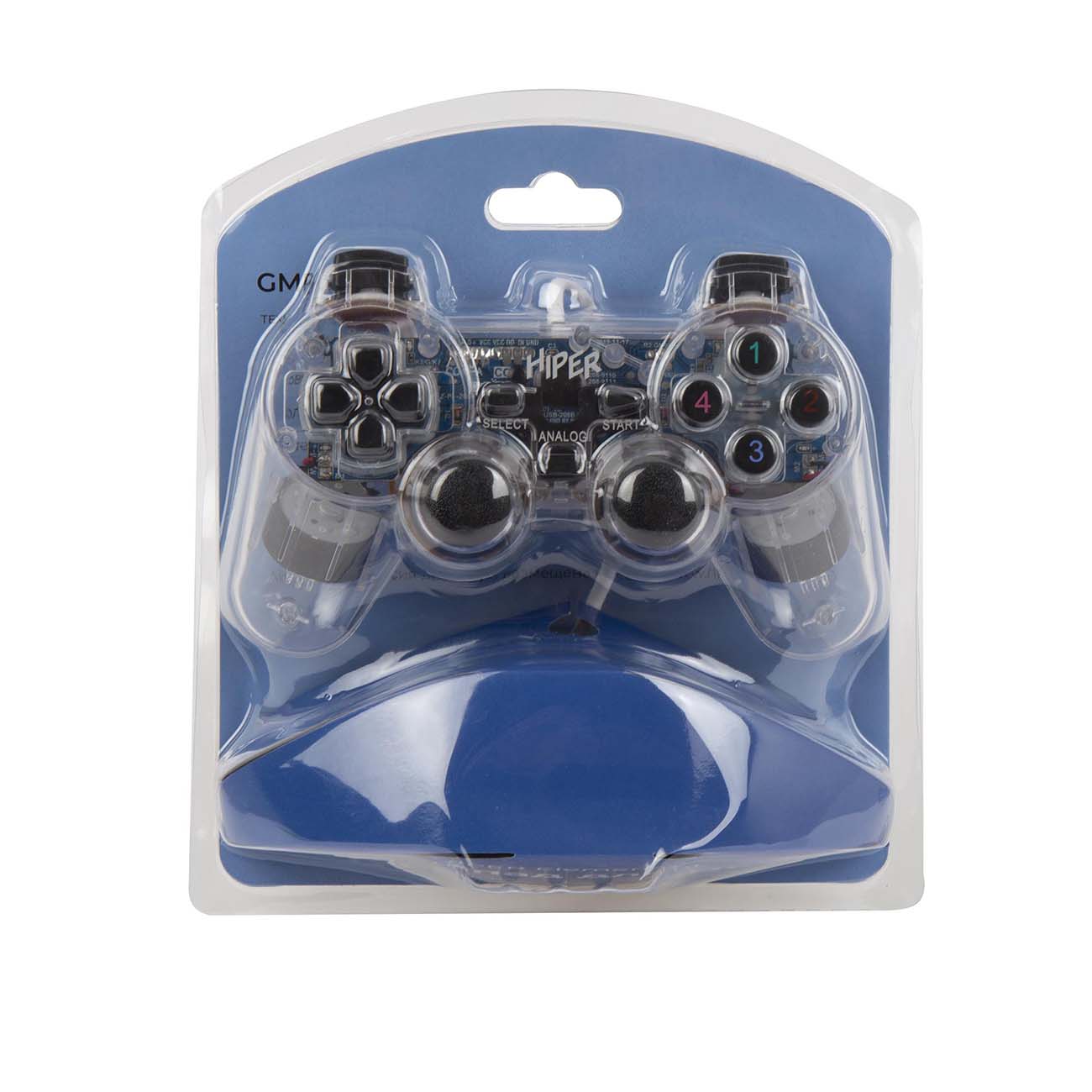 Геймпад Hiper GMP-002 подключается к совместимым устройствам с помощью USB-кабеля 1,4 м. Он весит 220 г, его корпус сделан из полистирола. На нем размещены 17 клавиш, в том числе кнопка-крестовина. Предусмотрены два мини-джойстика. Два встроенных вибромотора делают игры особенно реалистичными благодаря функции обратной связи.