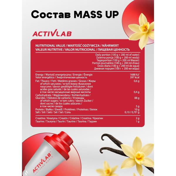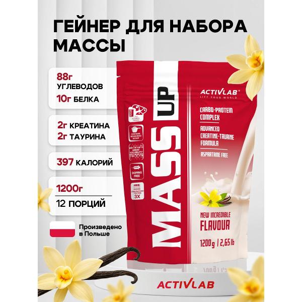 Гейнеры Activlab Mass up УТ000000543 разработан для активных людей, ставящих цель увеличить мышечную массу и повысить общую работоспособность. Состав подходит как для силовых тренировок, так и для интенсивных аэробных нагрузок, обеспечивая необходимое питание для роста и восстановления.