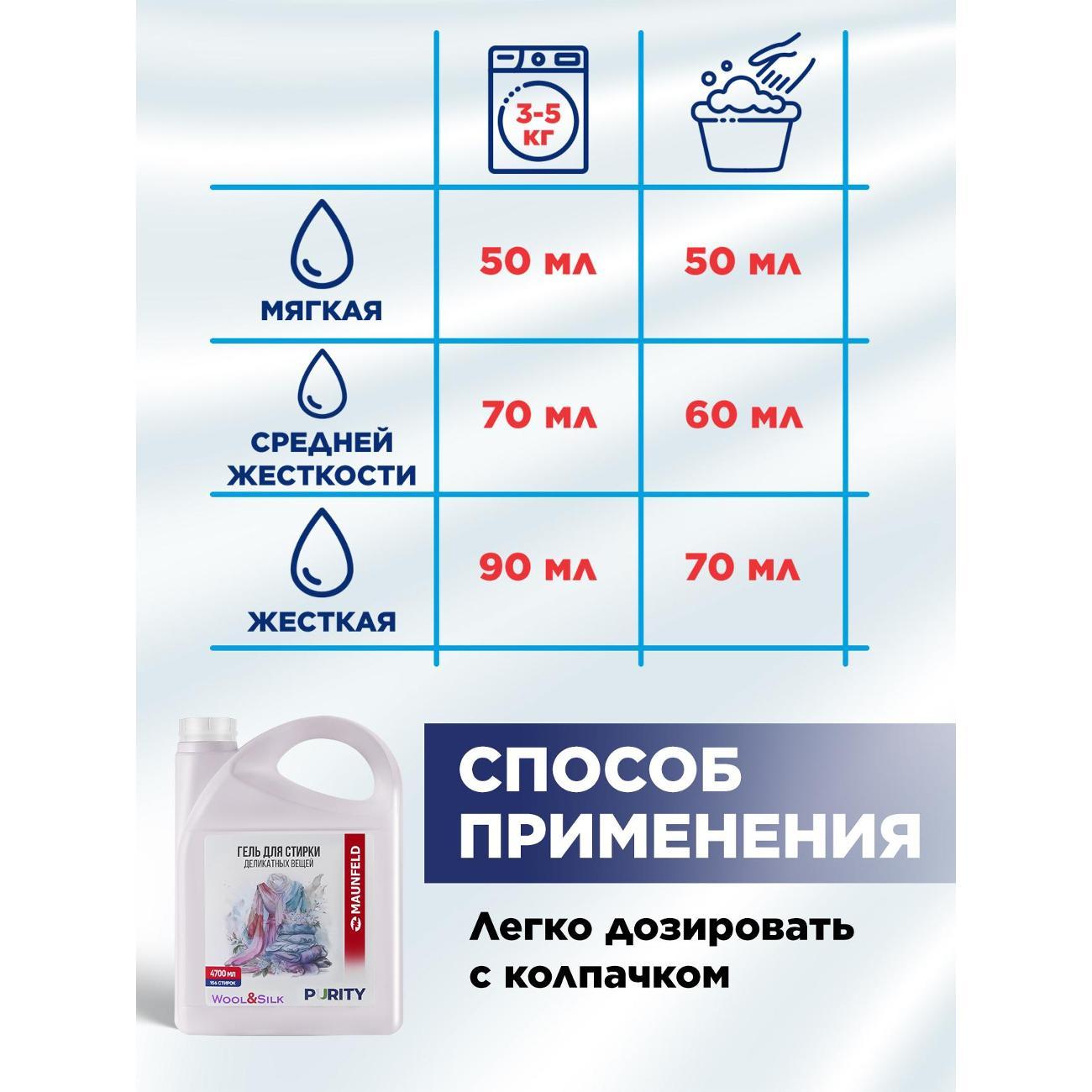Вы можете купить Гель для стирки Maunfeld Purity Wool&Silk, 4.7л в магазинах М.Видео по доступной цене. Гель для стирки Maunfeld Purity Wool&Silk, 4.7л: подробное описание, фото и отзывы реальных покупателей, характеристики, возможность скачать инструкции и подобрать аксессуары.