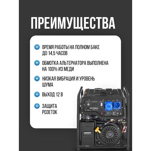 Генератор отличается относительно низким уровнем шума (до 74 дБ) благодаря наличию глушителя. Четырехтактный одноцилиндровый двигатель мощностью 16 л. с. совершает до 3500 оборотов за одну минуту. Расход топлива составляет 15 л/ч. Масляный бак вмещает до 1,1 л жидкости. Индикатор позволяет следить за уровнем топлива. Для контроля напряжения предусмотрен встроенный цифровой вольтметр.