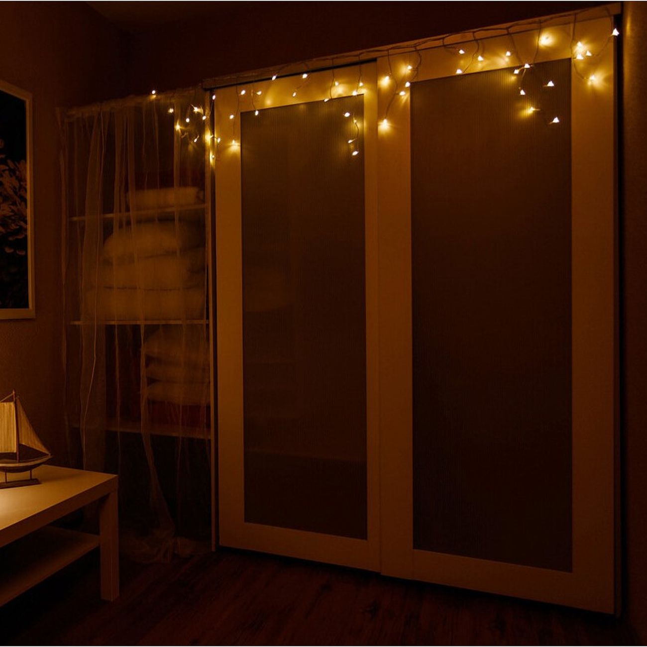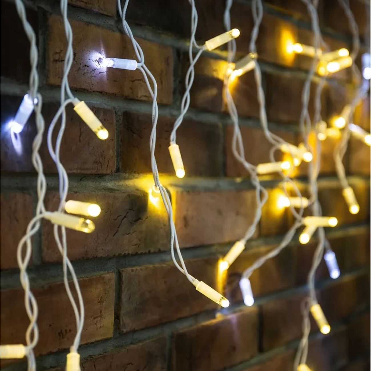 Гирлянда Neon-Night «Айсикл» состоит из вертикальных нитей разной длины, зафиксированных на шнуре-шине в виде бахромы. Аксессуар органично украсит фасады, окна, карнизы, арки домов, магазинные витрины, поможет декорировать внутренние помещения.