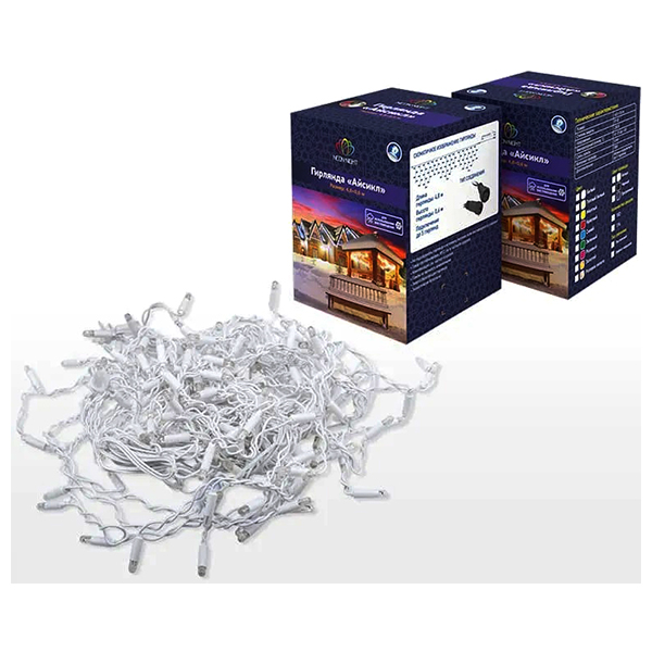 Гирлянда Neon-Night «Айсикл» состоит из вертикальных нитей разной длины, зафиксированных на шнуре-шине в виде бахромы. Аксессуар органично украсит фасады, окна, карнизы, арки домов, магазинные витрины, поможет декорировать внутренние помещения.