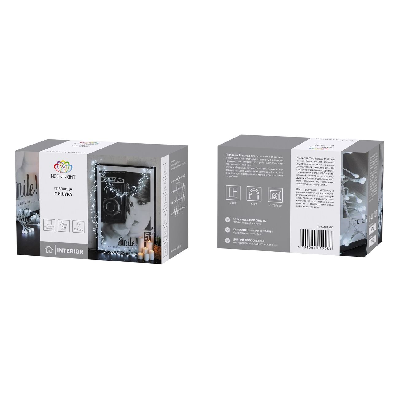 Токопроводящий сердечник этой модели заключён в прочную и гибкую оплётку из ПВХ. На концах «мишуры» на одинаковом расстоянии встроено 576 диодов, которые обеспечивают яркое белое свечение. Украшение предназначено для использования внутри помещений.