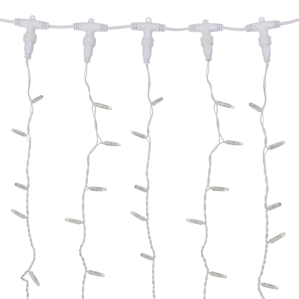 Основа этой модели – гибкий шнур-шина. С него свисают нити со встроенными диодами. Конструкция обладает высокой степенью защиты, что позволяет размещать её на улице. Гирлянде не страшны пыль и вода. С помощью встроенного разъёма и штепселя по краям основного провода вы сможете объединить в одну сеть несколько подобных украшений, чтобы сформировать большое полотно.