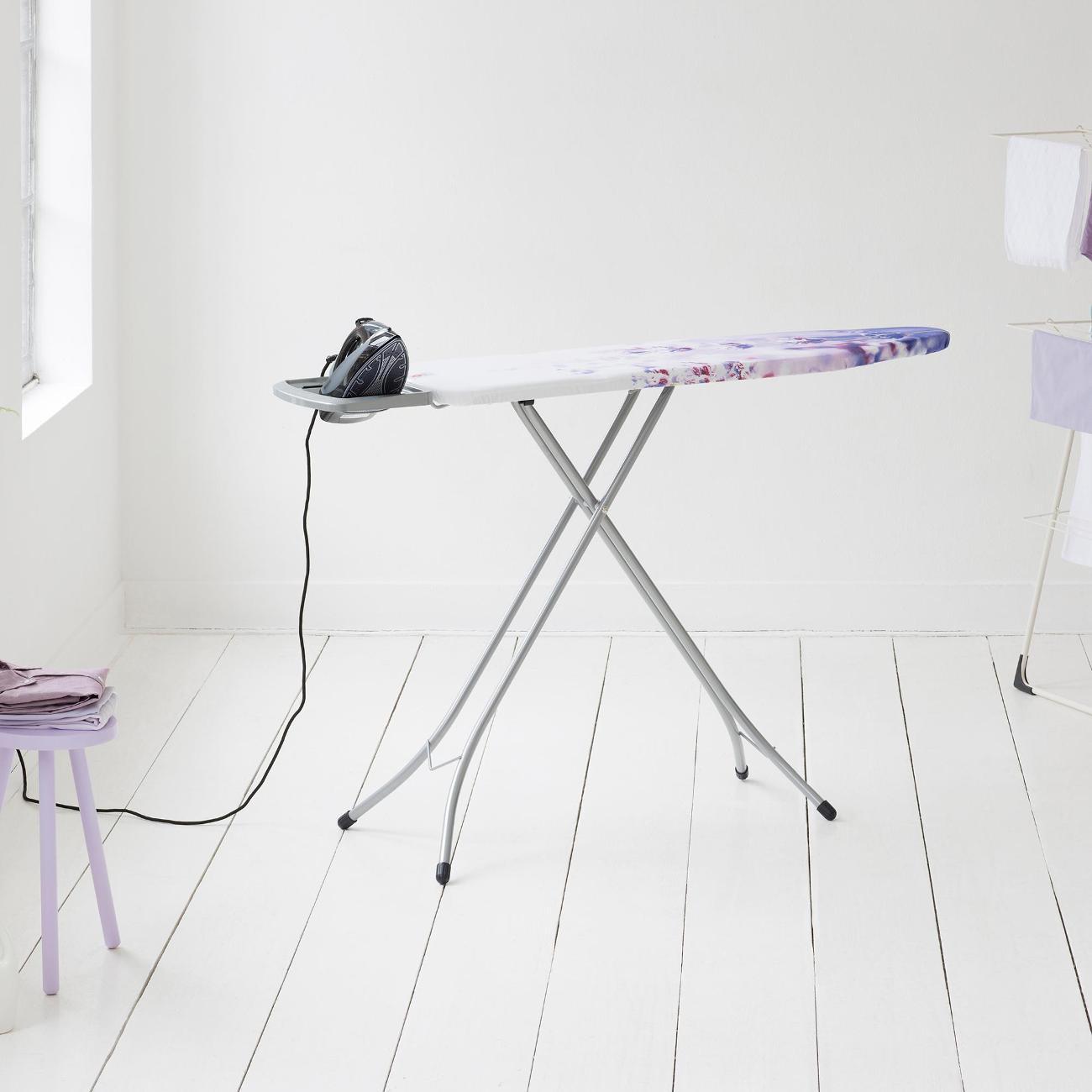 Мне очень понравился нежный рисунок, нанесенный на чехле. Высота выставляется на необходимом уровне в нескольких позициях, что комфортно для пользователей разного роста. Есть удобная подставка, которая подходит практически для любого парогенератора или утюга. Этим обеспечивается универсальность конструкции. А эргономичность гарантируется благодаря легкому и быстрому складыванию. Нам реально нравится данная вещь.