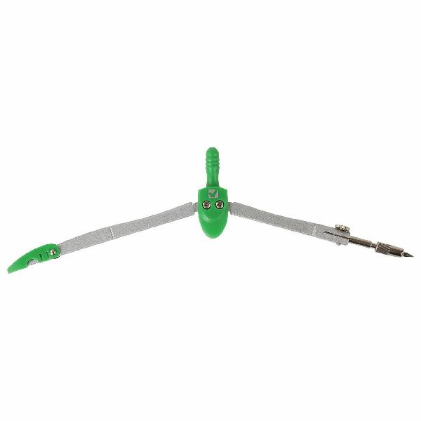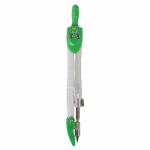 Циркуль длиной 125 мм имеет несгибаемые штанги и защитный колпачок для иглы. Изготовлен из металла, дополнительный цвет элементов – зеленый.