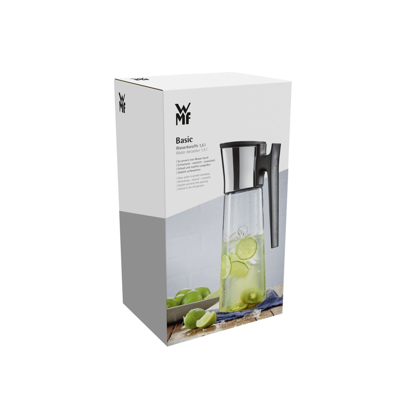 Графин просто украшение стола, особенно когда в нём прохладительные напитки из фруктов с мятой. Кристально прозрачное стекло и идеально отполированная сталь, выглядят весьма привлекательно. Крышка открывается сама при наклоне графина, наливает аккуратной струйкой, не капая на стол. Свою цену полностью оправдывает качеством и дизайном.