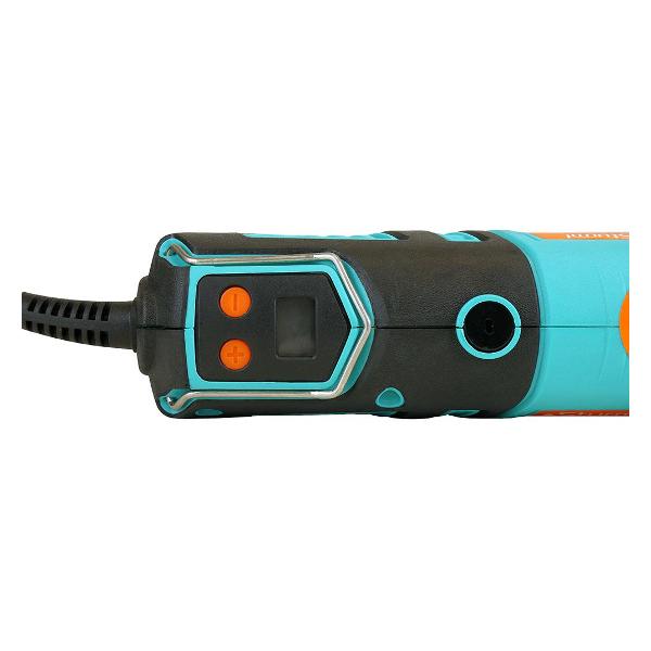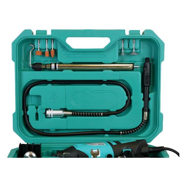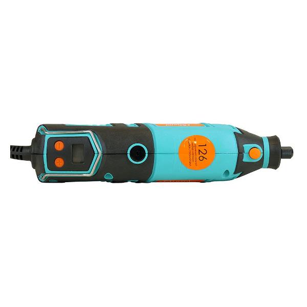 Модель комплектуется 126 насадками. Корпус изготавливается из пластика. Предусмотрена возможность фиксации шпинделя. Устройство оснащается системами плавного пуска и блокировки кнопки включения. Возможно поддержание постоянных оборотов под нагрузкой. Число оборотов варьируется от 8000 до 35000 об/мин.