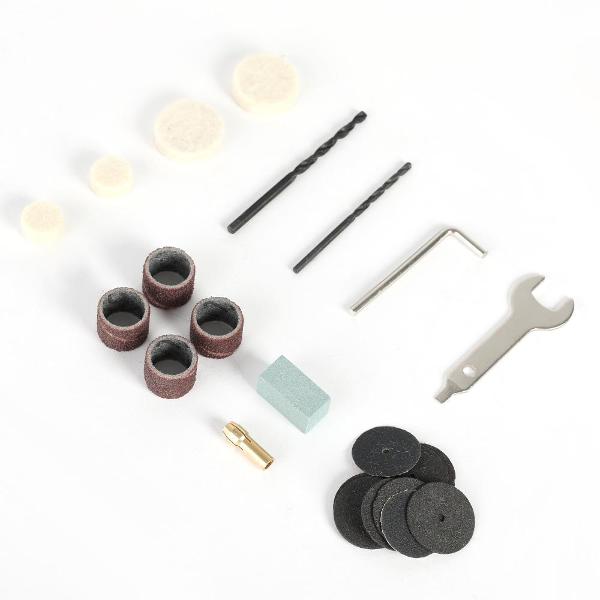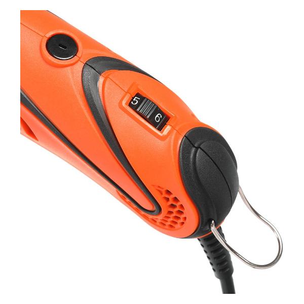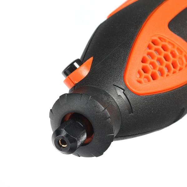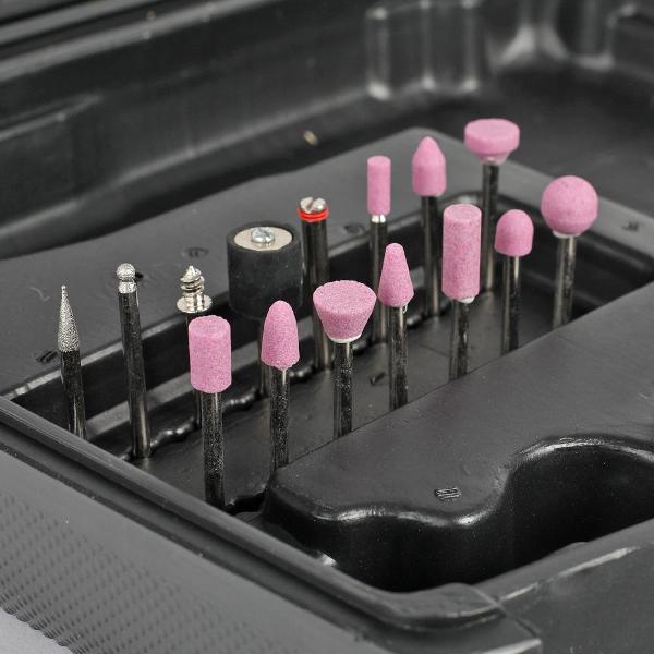 Предусмотрена электронная регулировка оборотов, фиксация шпинделя, блокировка кнопки включения для быстрой замены оснастки. Используемая система охлаждения гарантирует быстрый отвод горячего воздуха от двигателя. В комплекте — гибкий вал для работы в углах и углублениях и кейс, упрощающий транспортировку. Габаритные размеры инструмента — 8х8х20 см, вес — 700 г. Длина сетевого шнура равна 2 м.