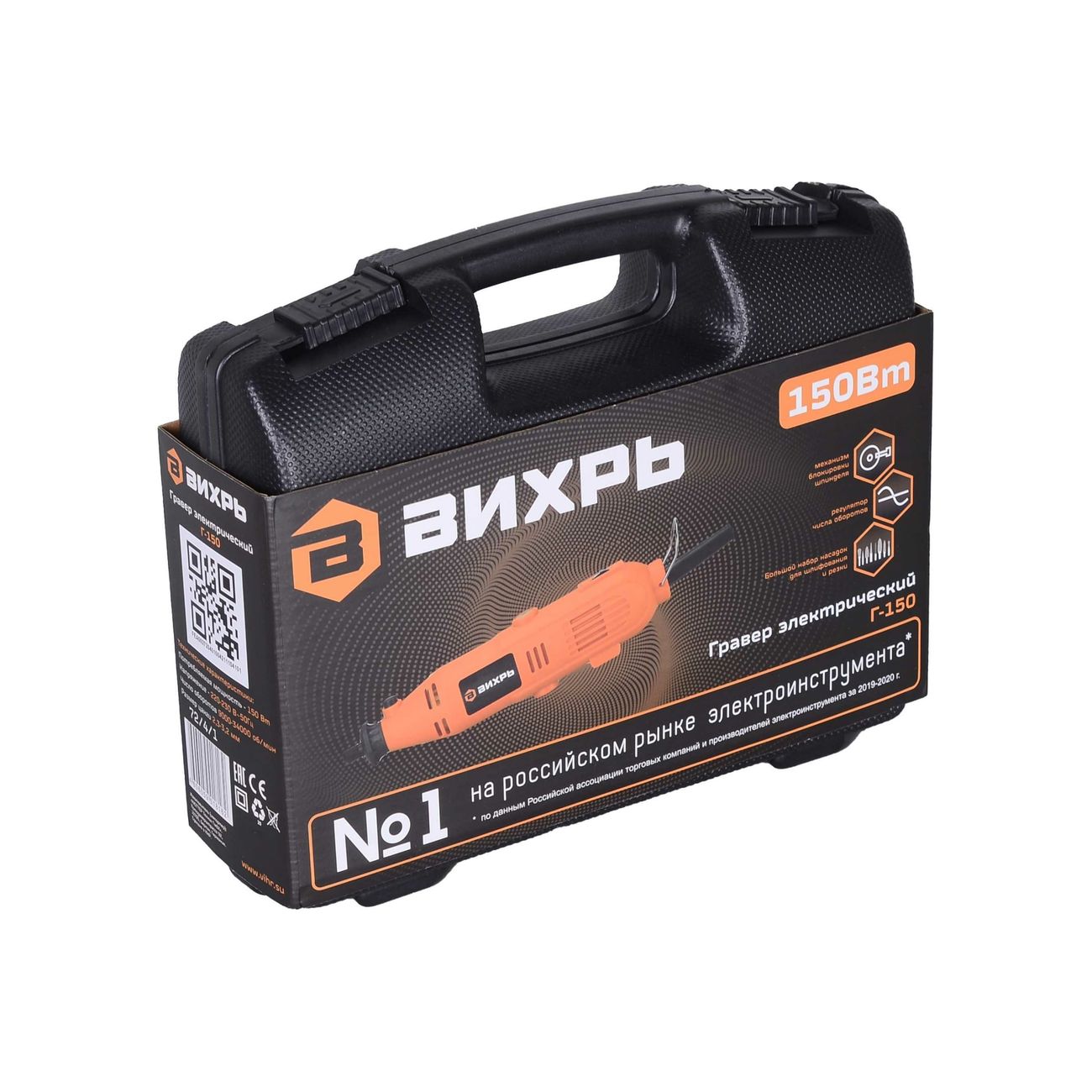 Гравер «Вихрь» Г-150 предназначен для мелких работ: гравировки, сверления, резки, полировки, шлифования. Устройство способно выполнять от 9000 до 30000 об/мин. Его мощность составляет 150 Вт. Есть регулировка оборотов и фиксация шпинделя. Корпус устройства вытянутой формы, что позволяет сделать удобный захват во время работы. В конструкции предусмотрена петля для подвешивания. На корпусе есть отверстия для вентиляции, чтобы защищать двигатель от перегрева. В комплекте с гравером поставляются: расширенный набор насадок, пластиковый кейс для хранения и переноски устройства.