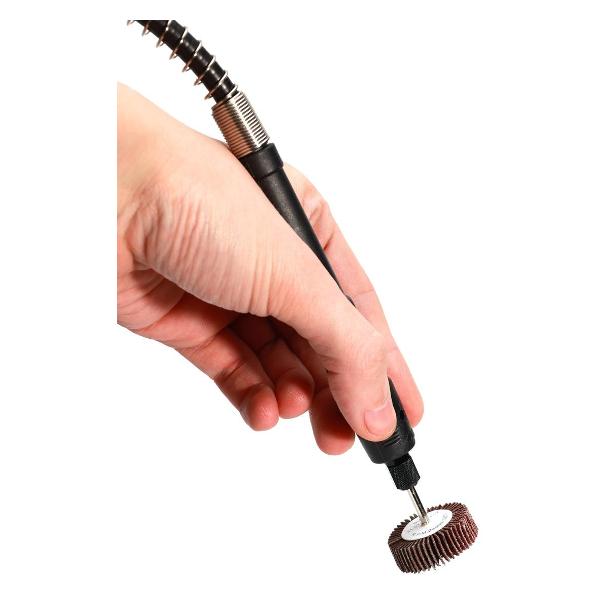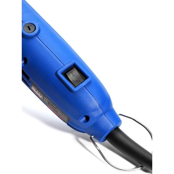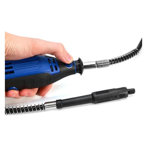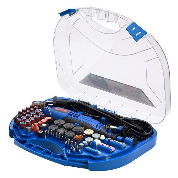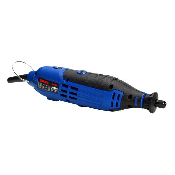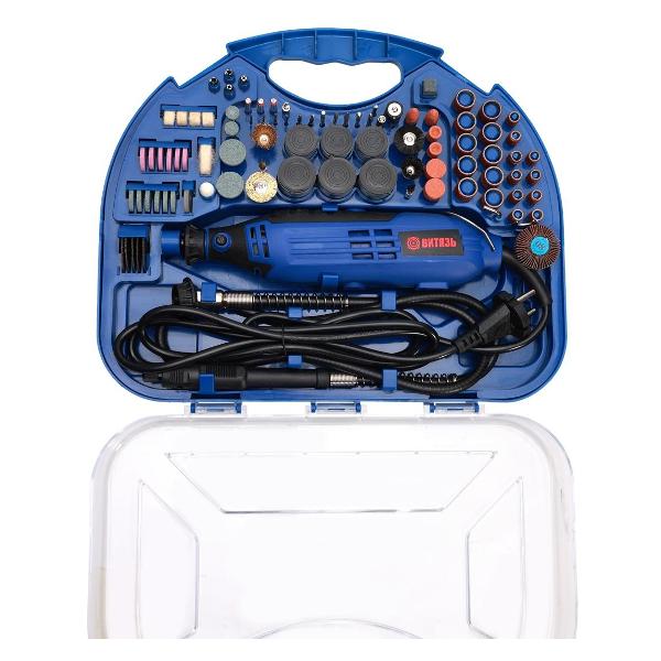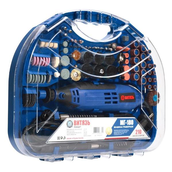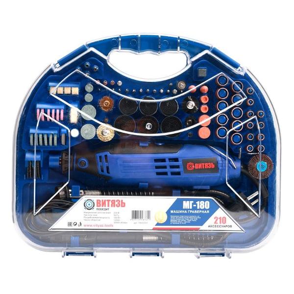 Гравер «Витязь» МГ-180 сине-черного цвета оснащен щеточным двигателем и электронной регулировкой оборотов (от 12000 до 30000 в минуту). Длина сетевого шнура — 1,8 м. Габариты модели — 35х8х30 см. Вес изделия — 2,05 кг. В комплектацию входит кейс для хранения и гибкий вал. Мощность прибора — 0,18 кВт. Диаметр патрона составляет 1,6–3,2 мм. Корпус сделан из прочного легкого пластика, оснащен дополнительными вентиляционными отверстиями. Вал блокируется с помощью кнопки. Тип патрона — зажимные цанги.